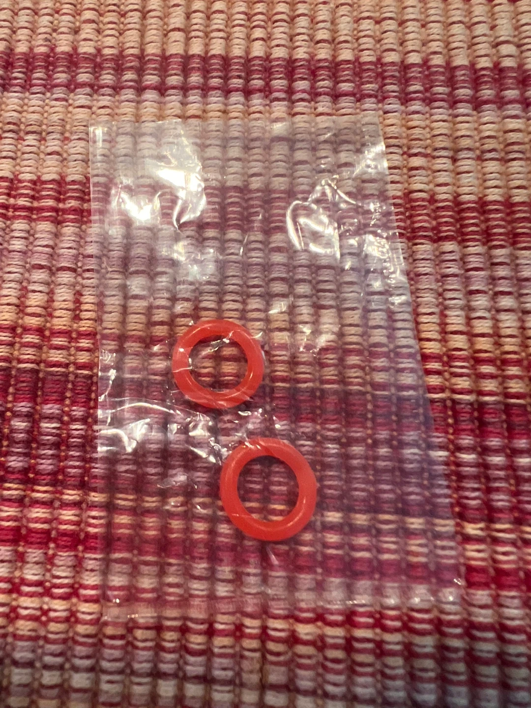 Here are two small red rubber O-rings, still in their original packaging. They look to be about 3/4 of an inch in diameter. Perfect for various DIY projects or replacements! O-rings are widely used as seals in plumbing, automotive systems, hydraulic and pneumatic equipment, and many other industrial and household applications to prevent leaks.