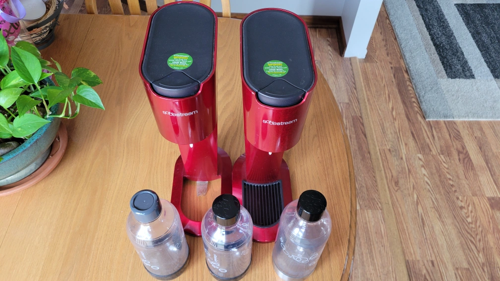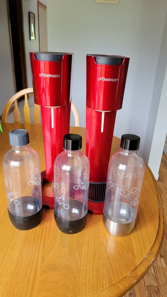 Selling two SodaStream machines in red, complete with three bottles! They are in good condition and ready to make sparkling water at home. Perfect for anyone who loves bubbly drinks!