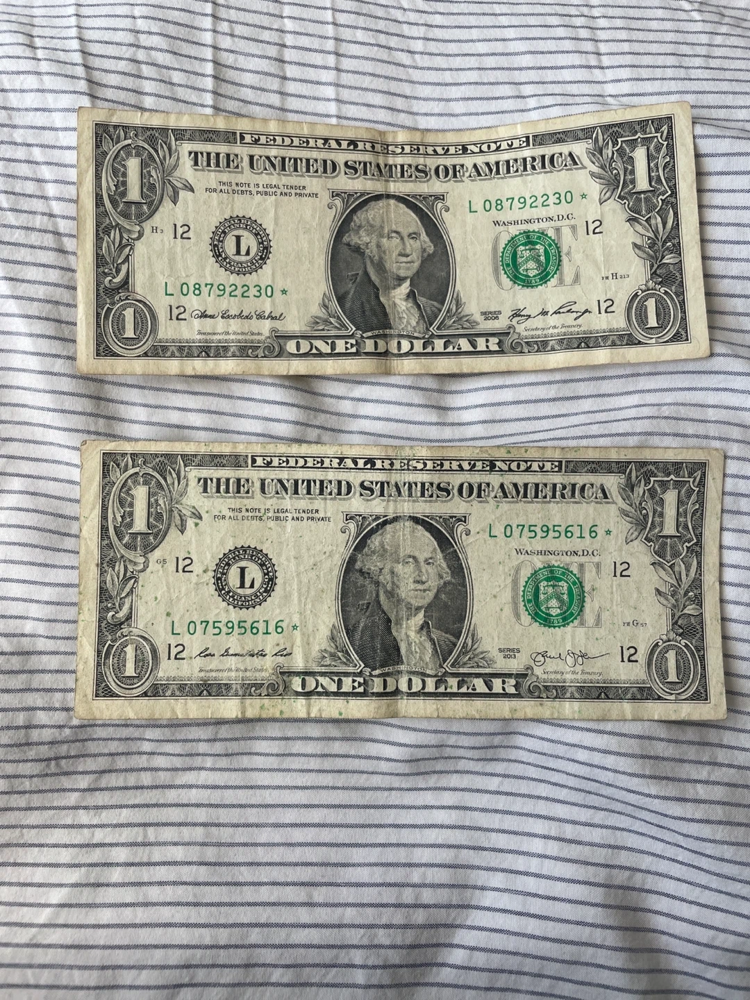 Selling two US one dollar bills. Both are in used condition. With start