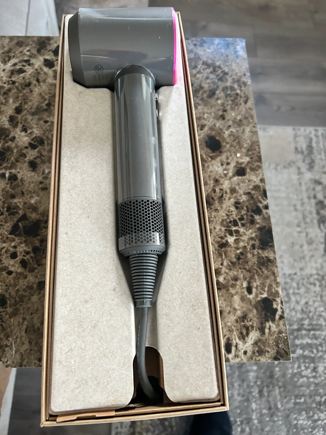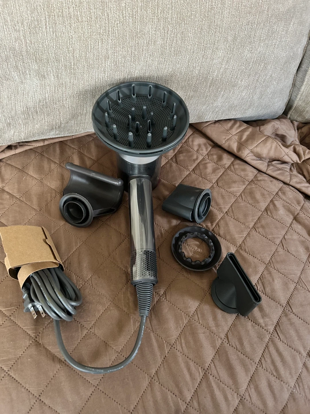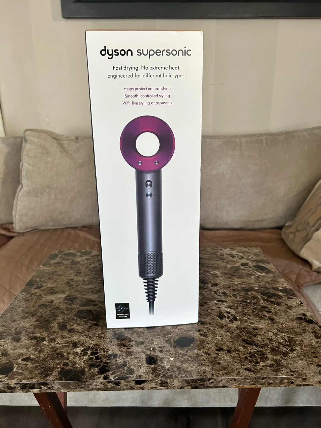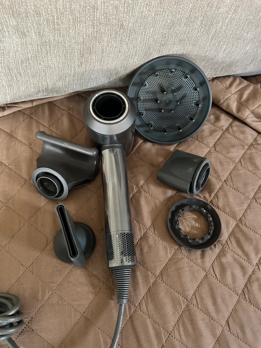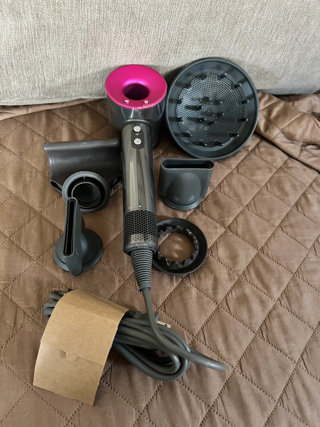 This Dyson Supersonic hair dryer comes with five styling attachments. It's engineered for different hair types and helps protect natural shine. Fast drying, no extreme heat! Used in excellent condition