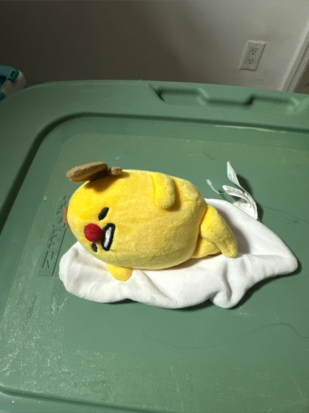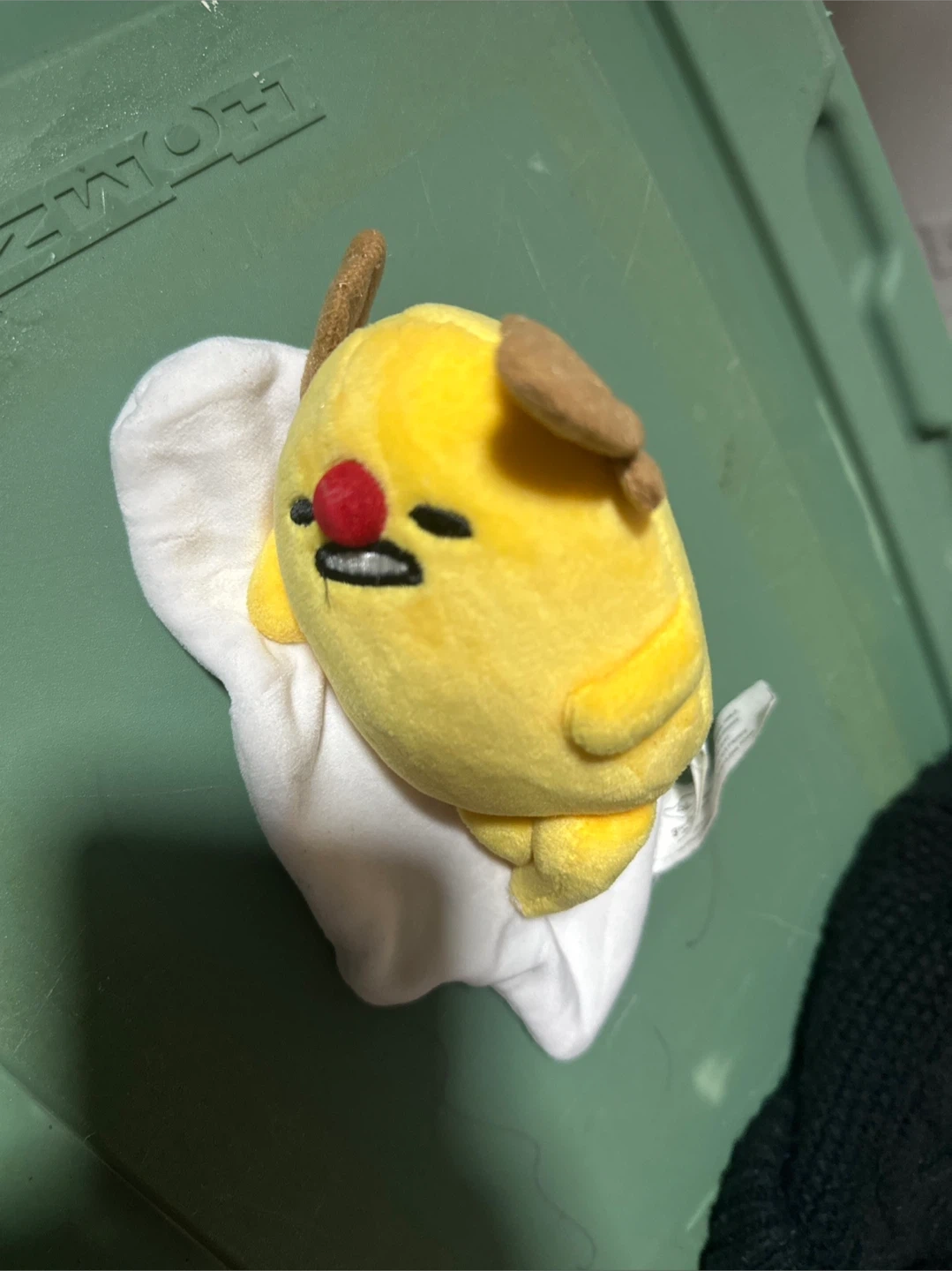 This is a soft, yellow plush toy. It features a red nose and simple facial details. The toy is designed to look like it's resting on a white cloth. It's a cute collectible item!