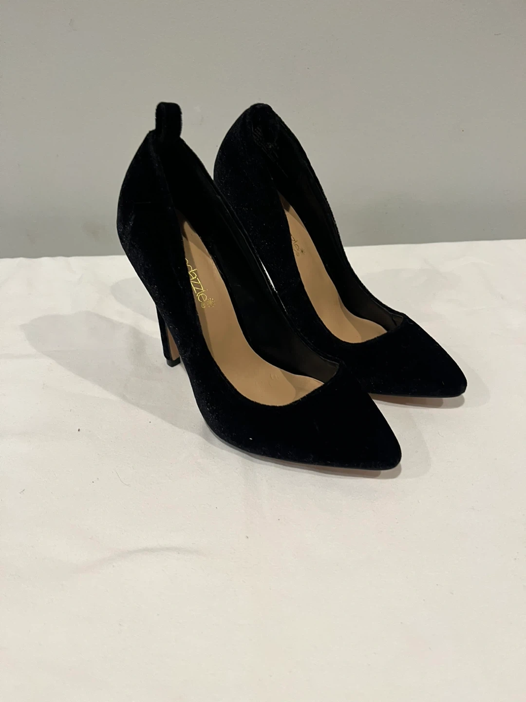 These black velvet heels from ShoeDazzle feature a classic pointed-toe silhouette. They have a sleek design perfect for dressing up any outfit.