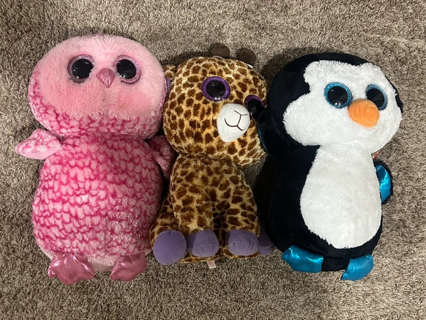 Selling a set of three large Ty Beanie Boos! Originally $50 a piece You'll get a pink owl, a giraffe, and a penguin. They're all in great condition and ready for a new home