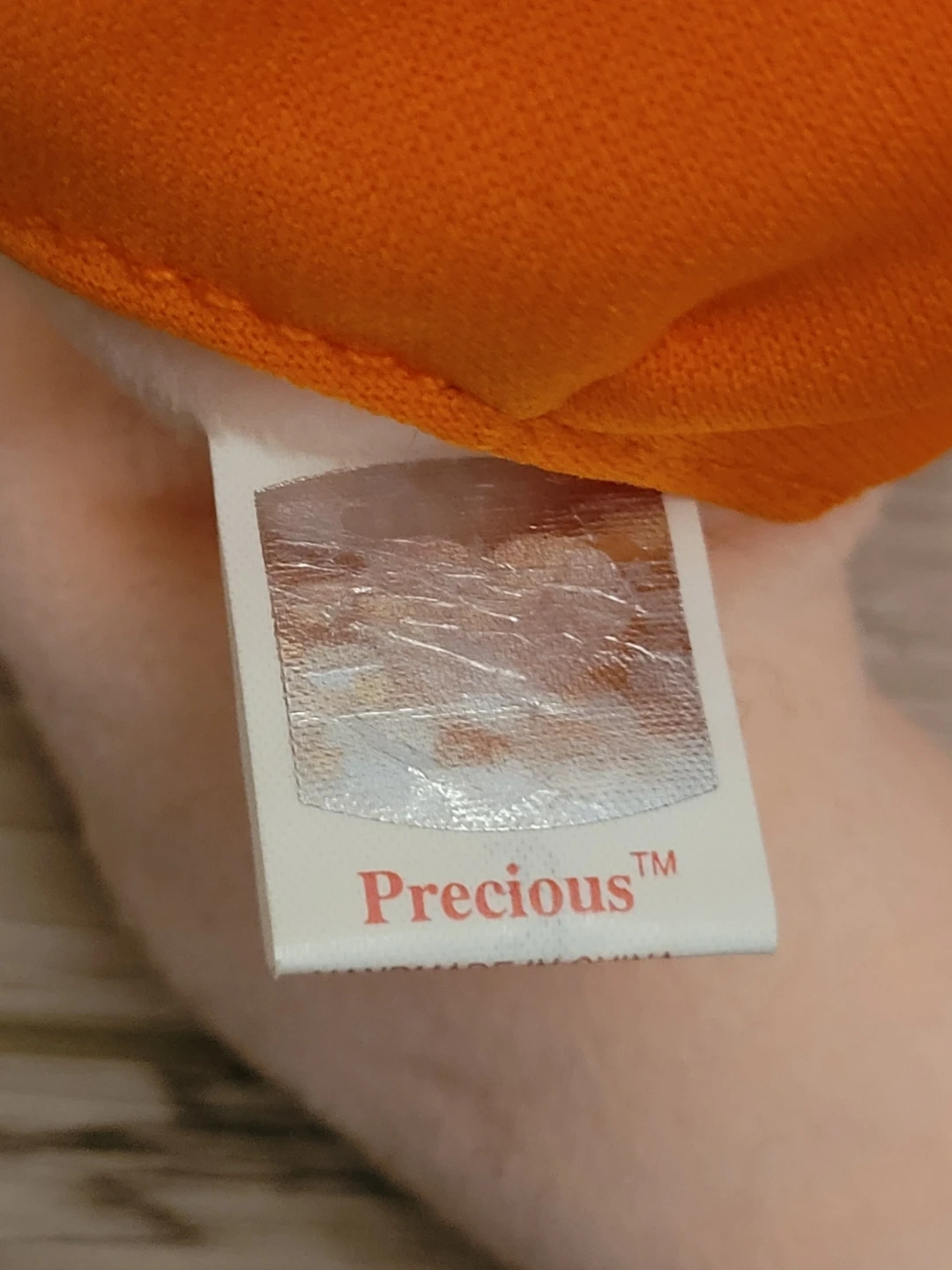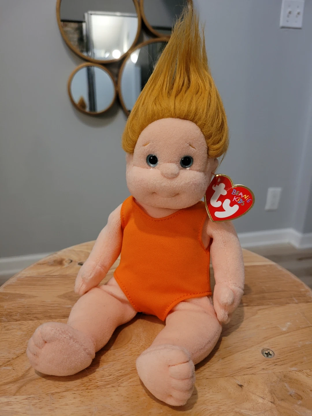 85Here's a cute Ty Beanie Kids doll looking for a new home! This adorable doll features a bright orange outfit and the classic Beanie Kids heart tag called Precious. It's in great condition and ready to be loved by a new owner. Approximately 10" long.