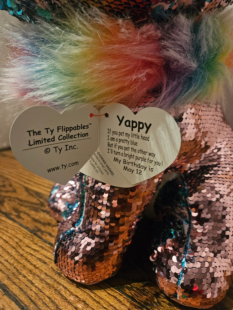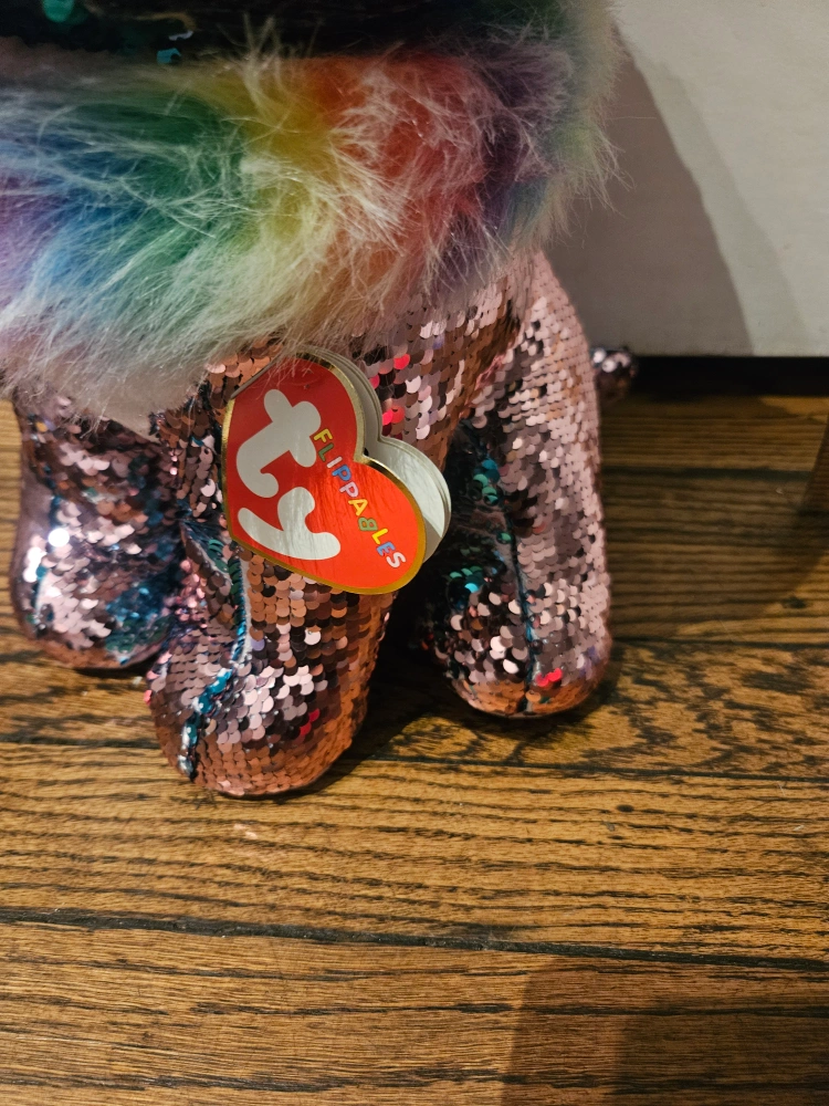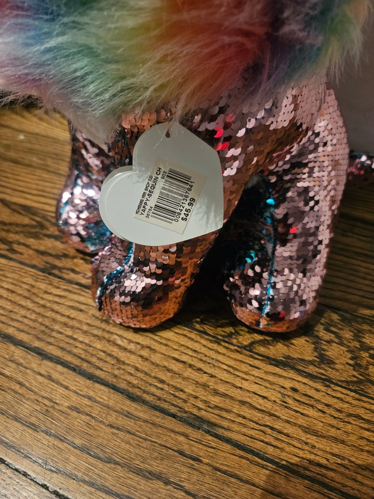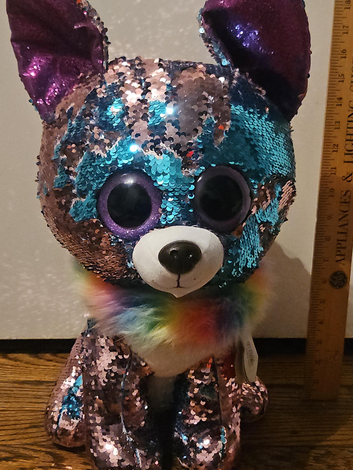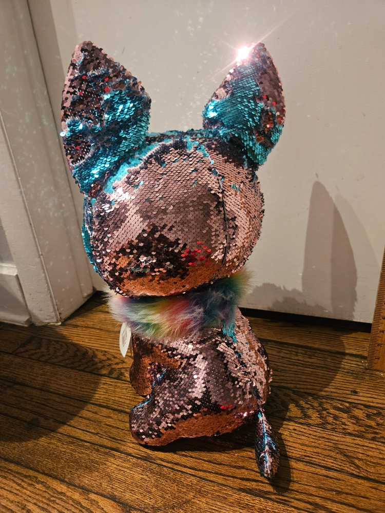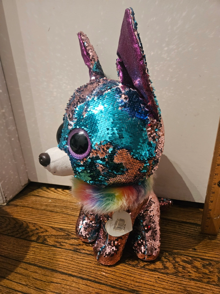 75This is a Ty Flippables Yappy Sequin Chihuahua plush toy! It is made of sequins and has a rainbow-colored mane.