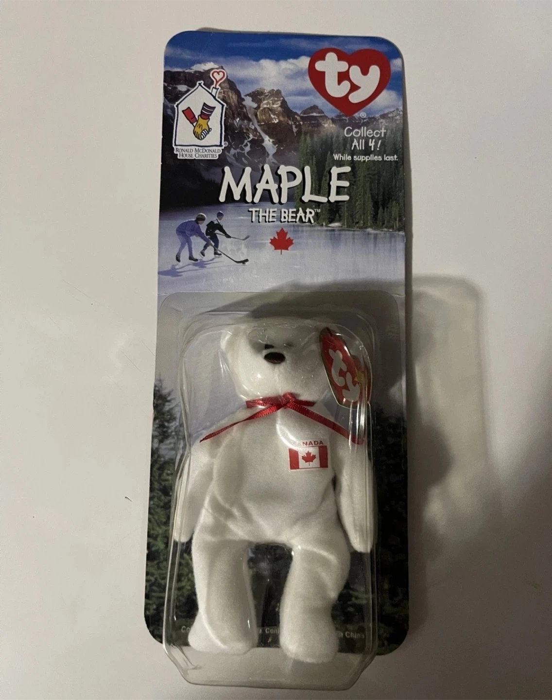 34Selling a brand new Ty Maple the Bear, still in its original packaging! This collectible is part of a series where you can collect all 4! It features a cute white bear with a Canadian flag on its chest and a red ribbon around its neck. A must-have for any Ty Beanie Baby collector!