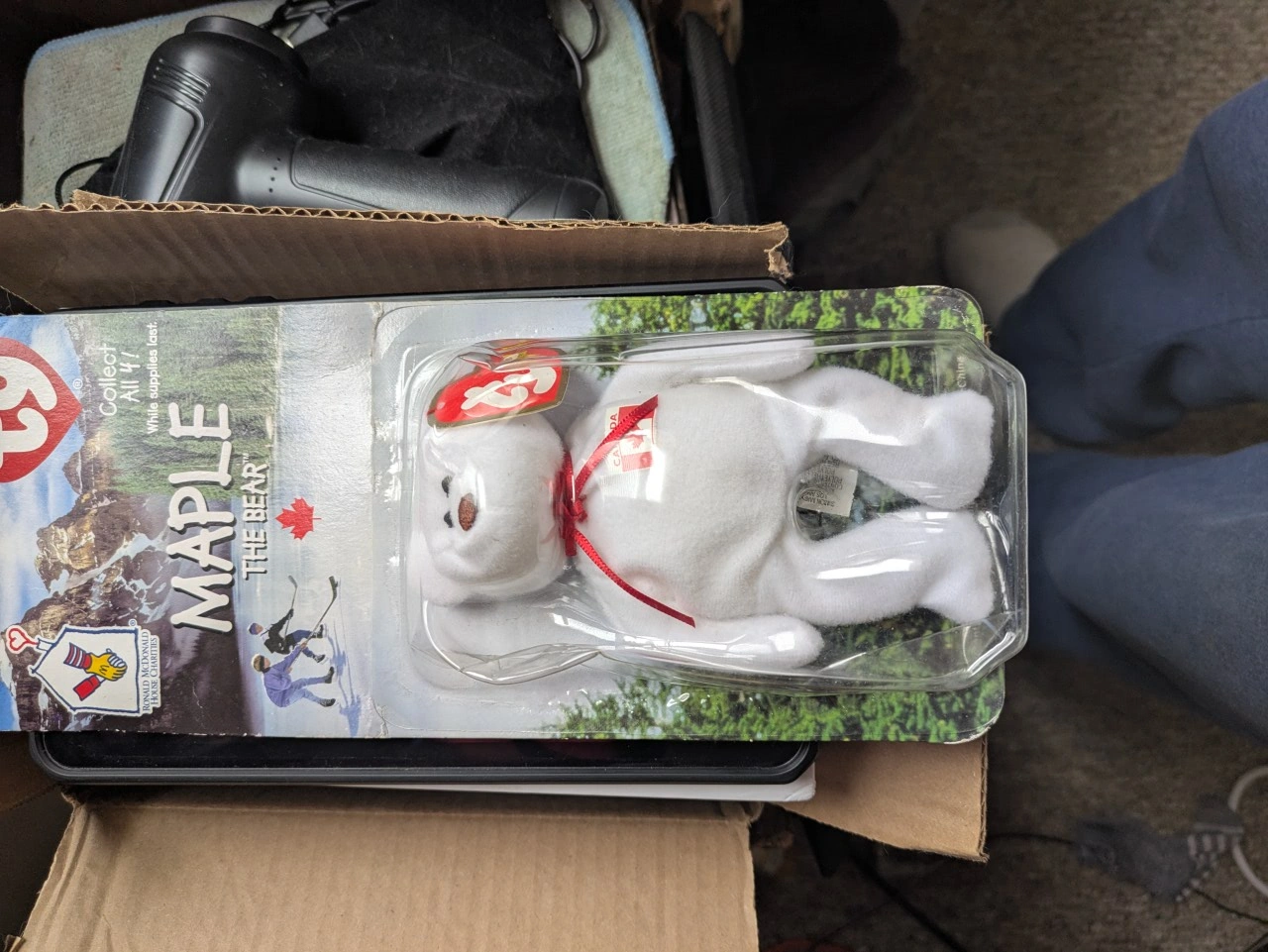 The bear is white. Comes in a clear plastic case. A great item for any fan of stuffed toys. This is one of the rare Maple the Bear beanie babies.