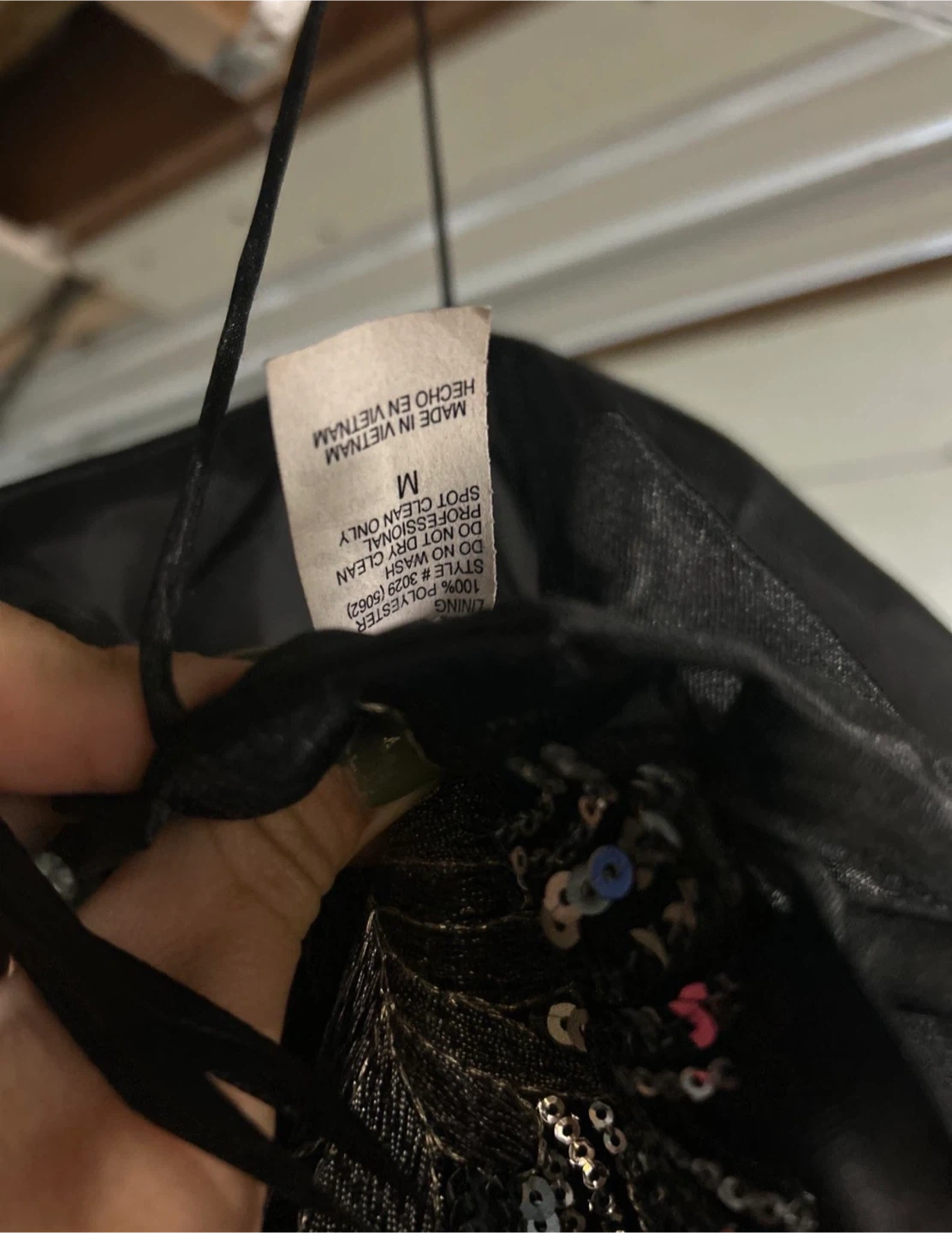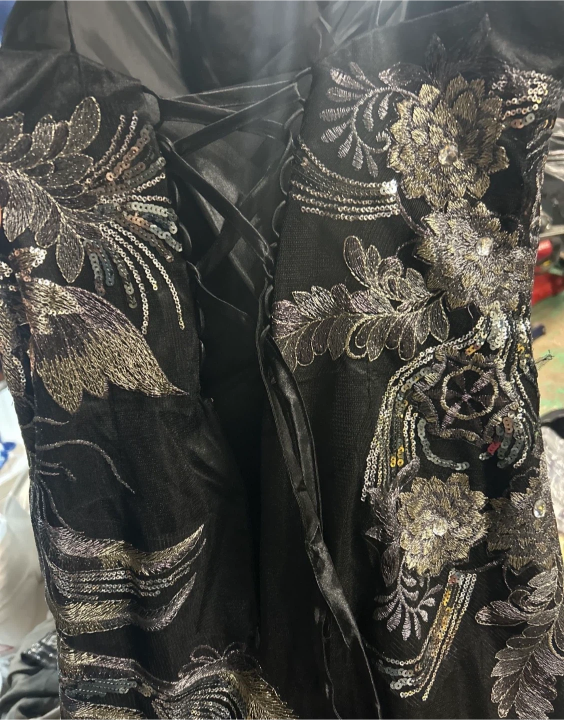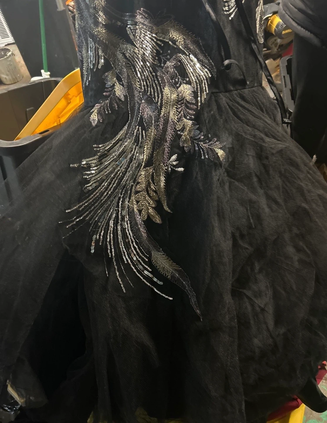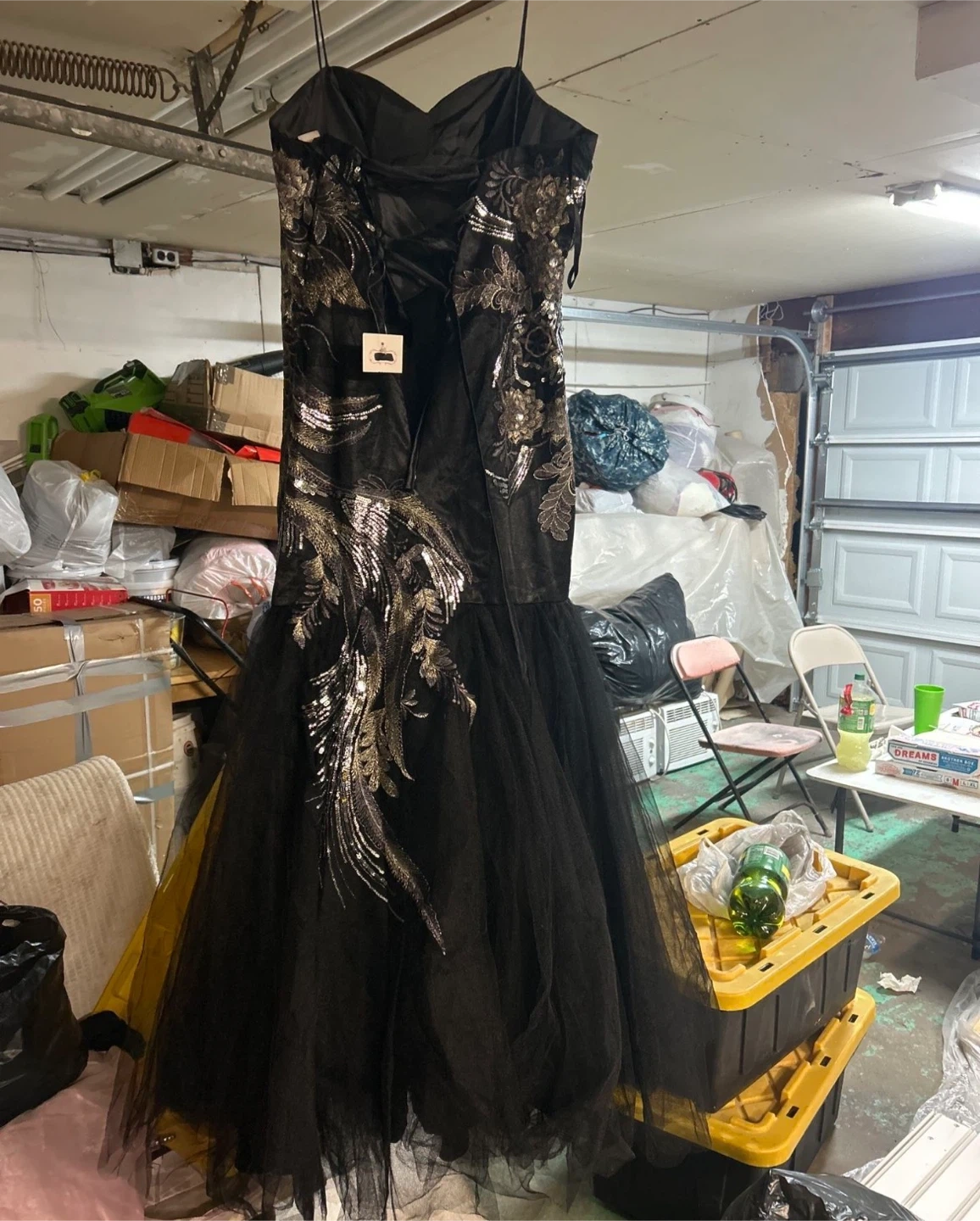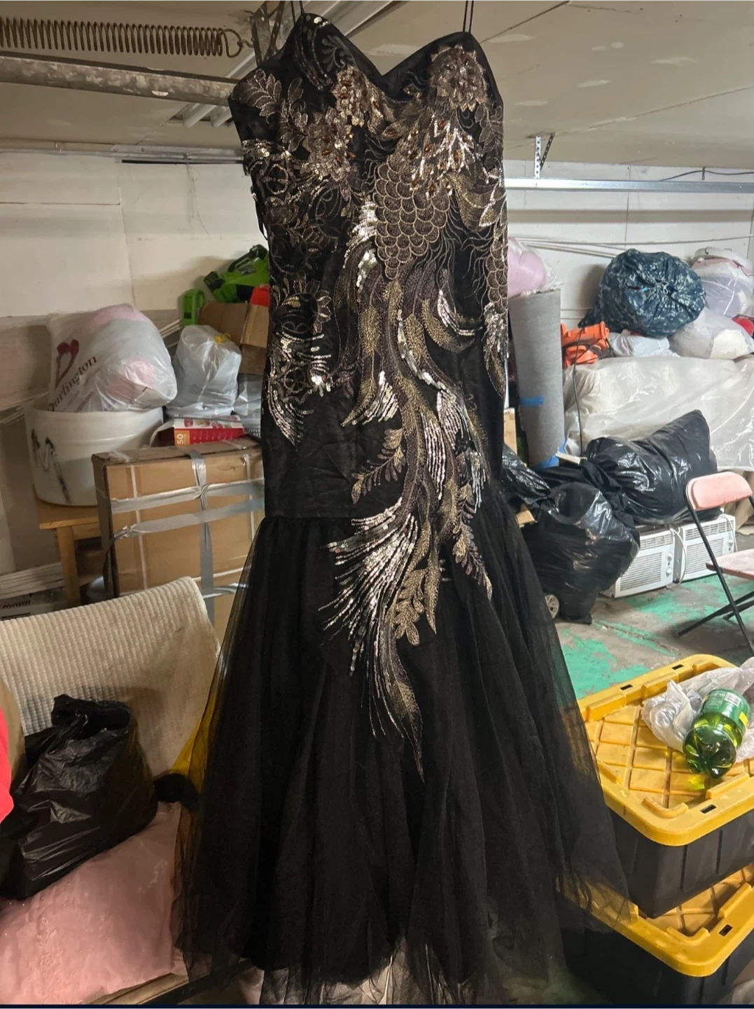 Selling a beautiful black formal dress in size M. It features elegant floral embellishments and a flattering silhouette. The dress is made from polyester and perfect for special occasions!