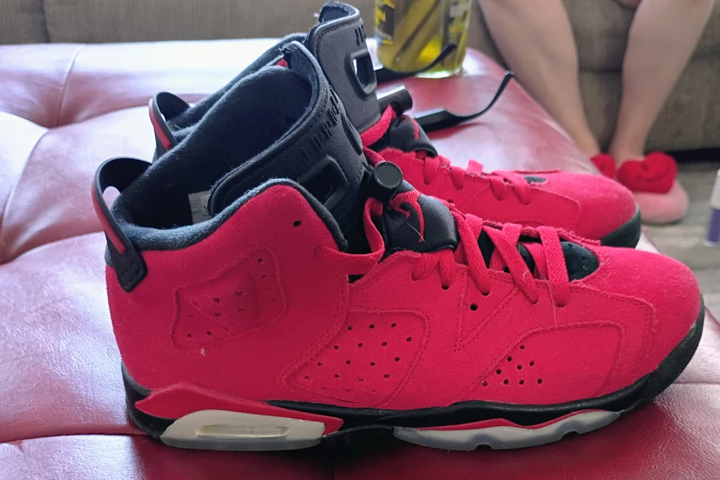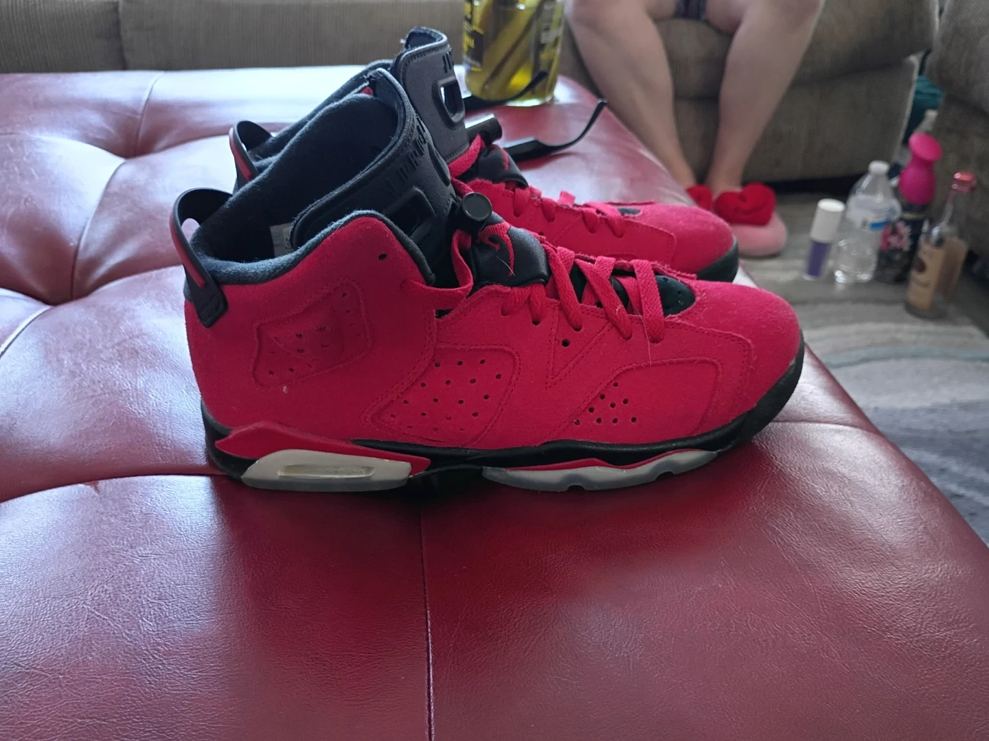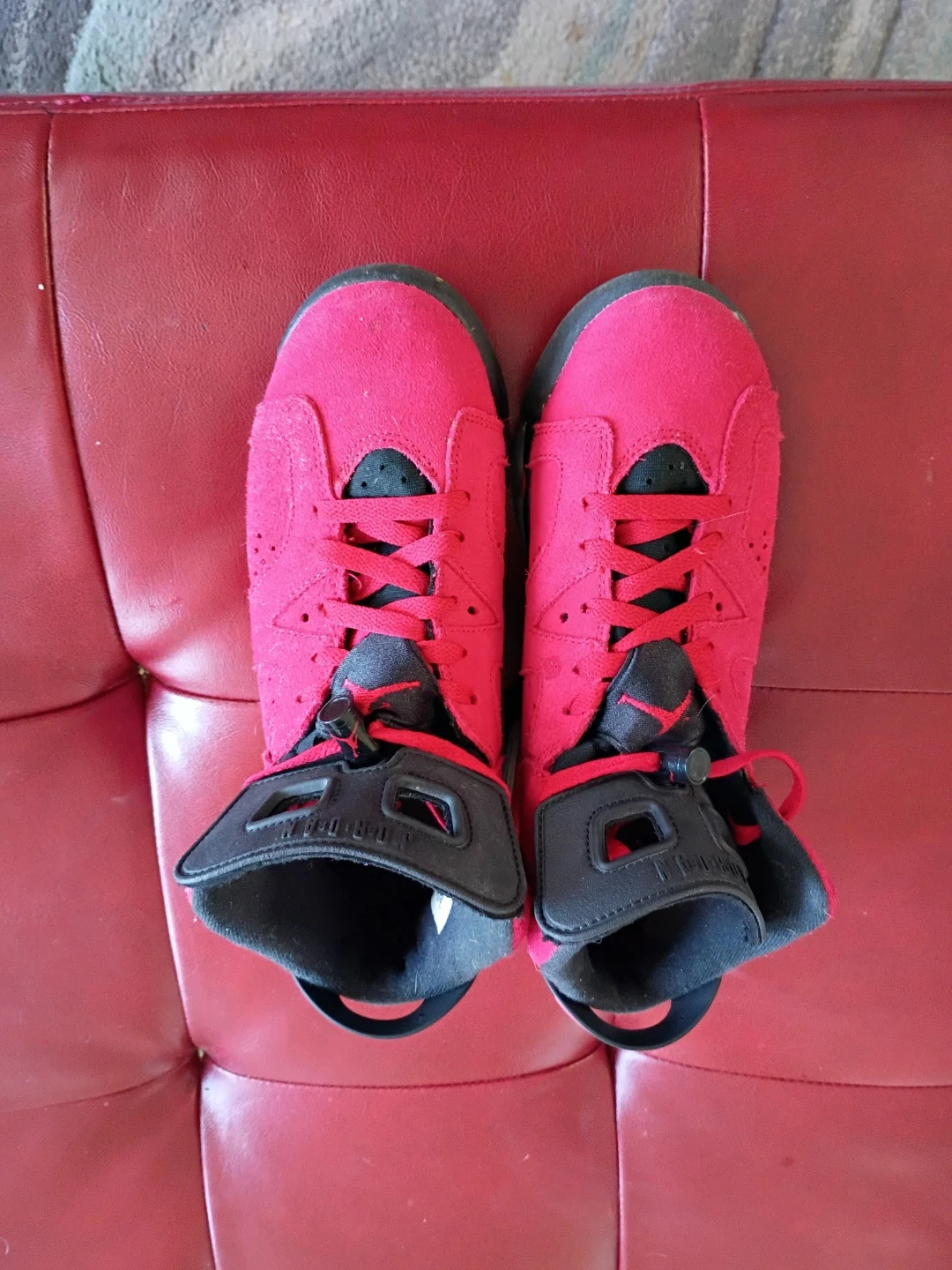 Iconic Air Jordan 6 Retro sneakers in a vibrant red and black colorway. Features suede uppers with perforations and a lace lock system. Excellent condition!