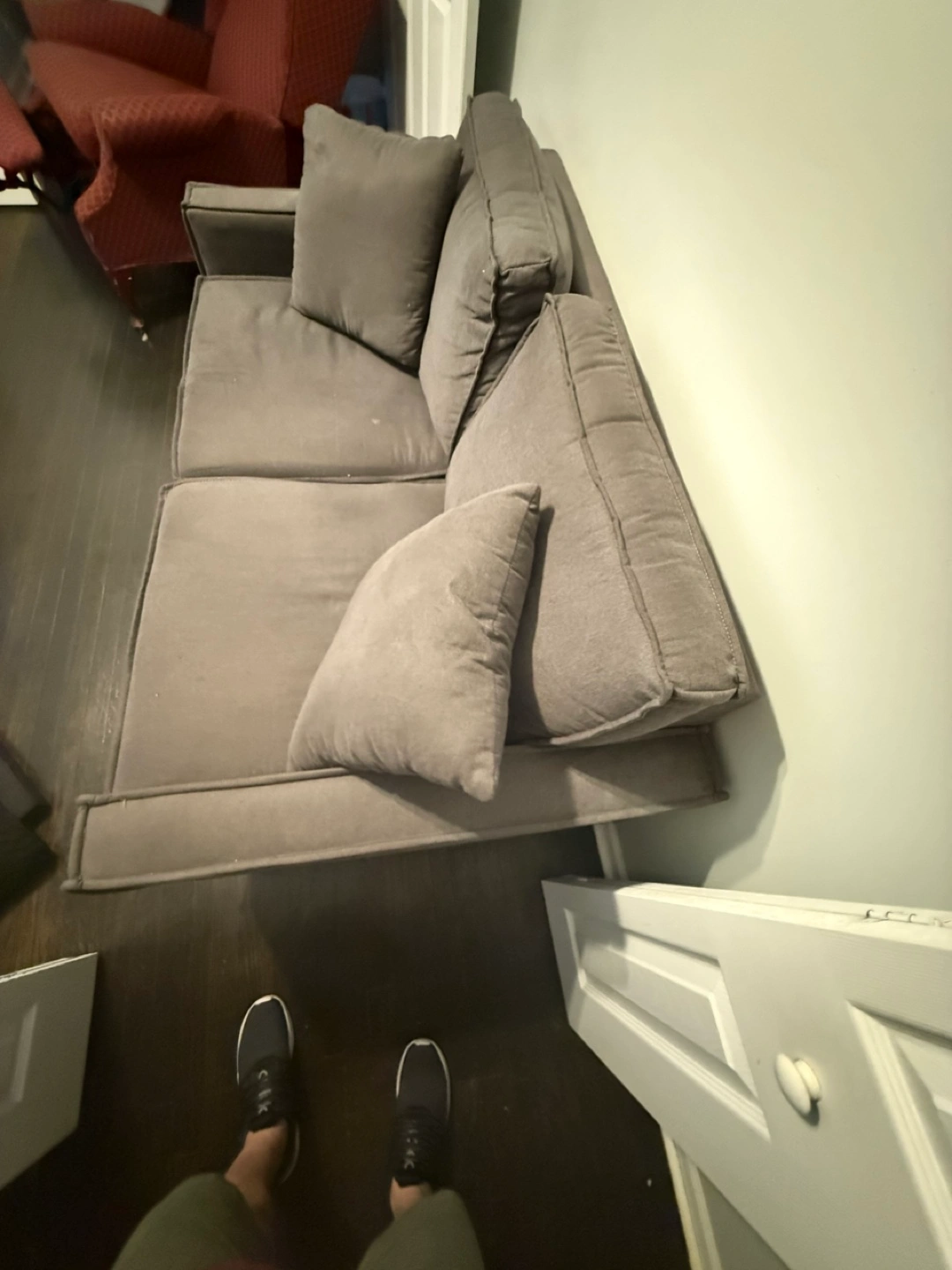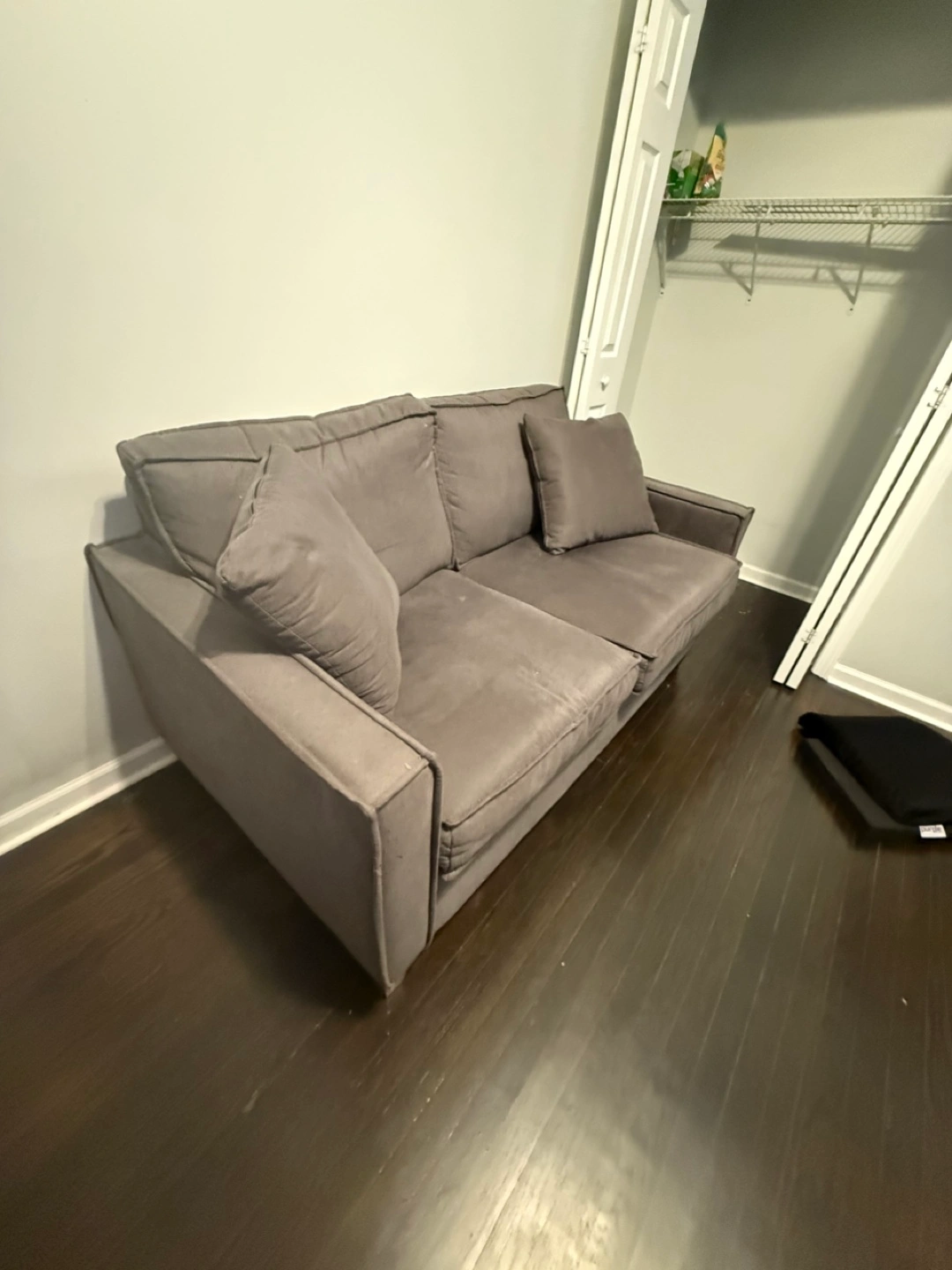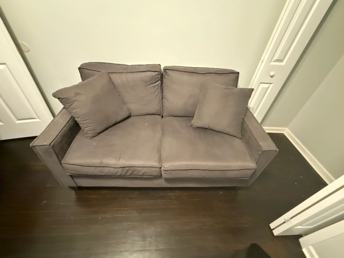 Selling a comfy gray sofa that comes with matching pillows for extra coziness. The small sofa is in good condition and ready for a new home. It's a great size for apartments or smaller spaces.