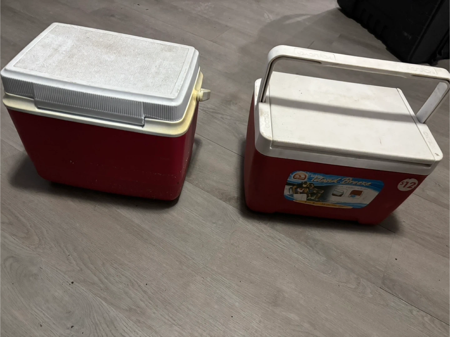 Selling two red Igloo coolers. One has a blue and white decal, the other is plain red and white. Both have carrying handles. These coolers are perfect for picnics or camping trips!