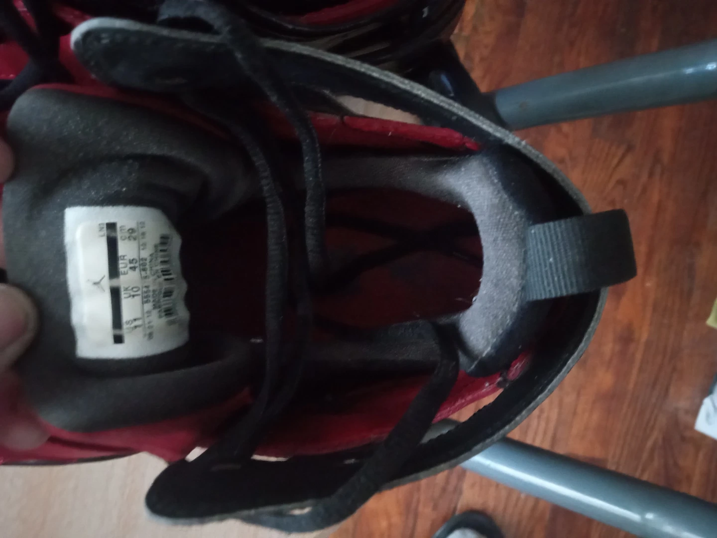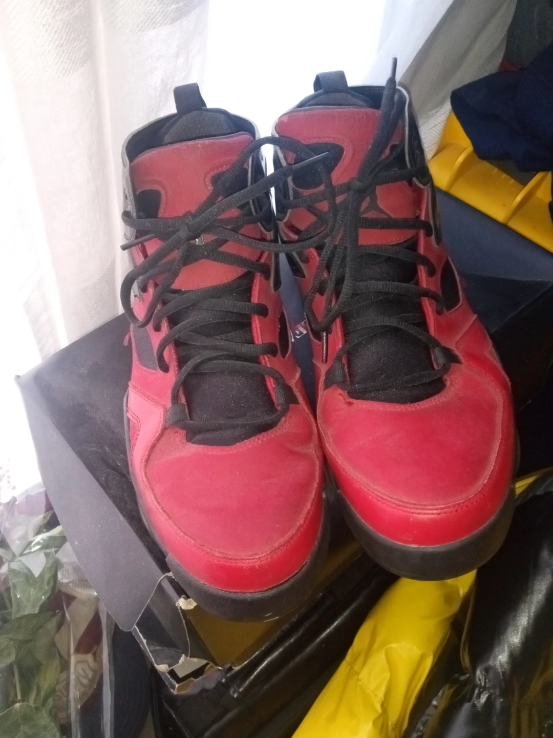 Selling a pair of Jordan Flight 45 High sneakers in red and black. They are in good condition and size 11 US.