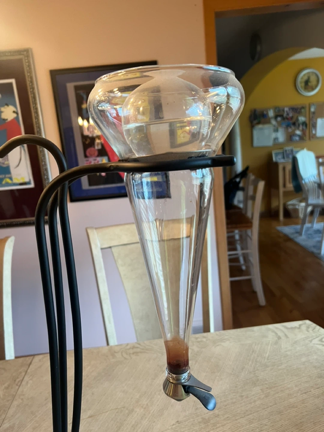 Selling a vintage glass wine decanter with a unique design! It features a glass upper bowl and a lower funnel shape, held by a black metal stand. Perfect for wine enthusiasts or as a decorative piece for your home bar