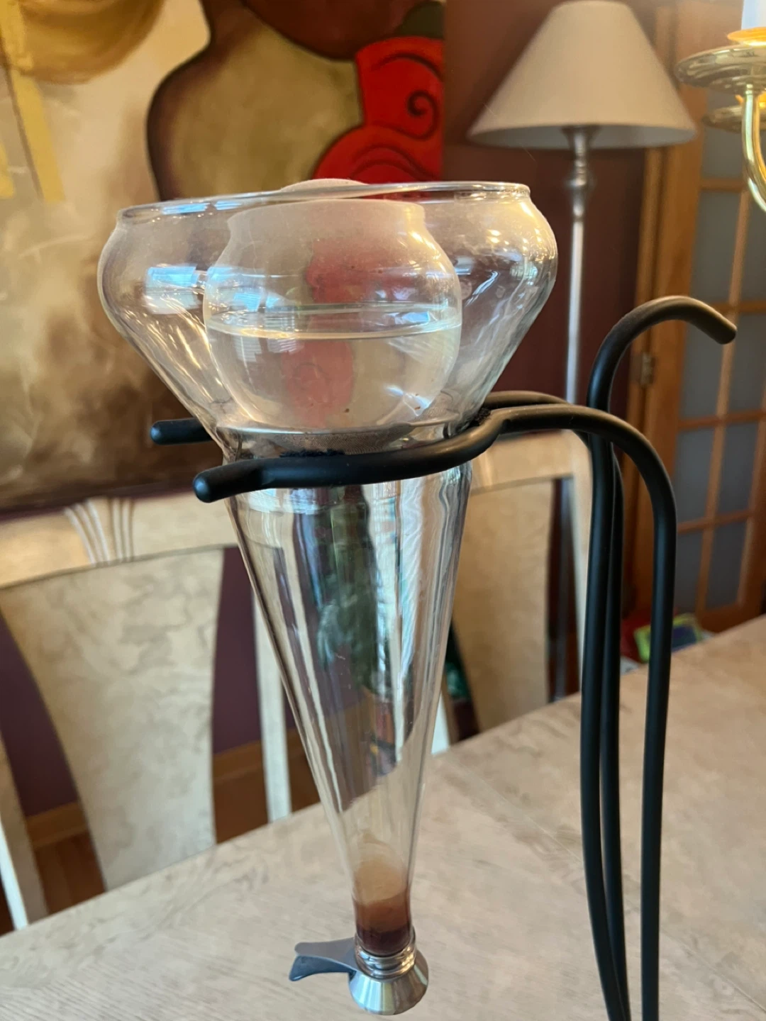 Selling a vintage glass wine decanter with a unique design! It features a glass upper bowl and a lower funnel shape, held by a black metal stand. Perfect for wine enthusiasts or as a decorative piece for your home bar
