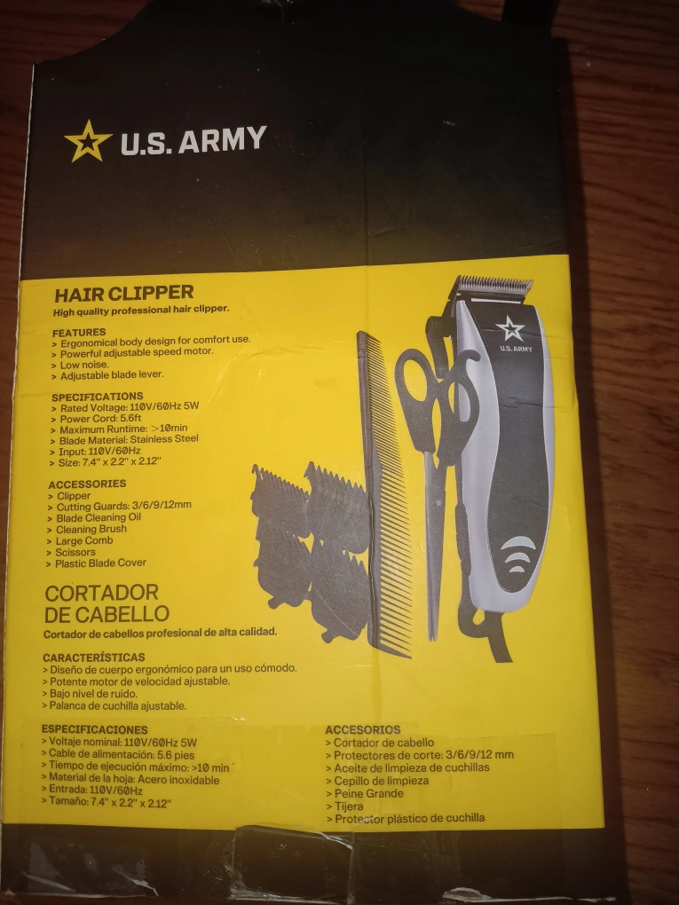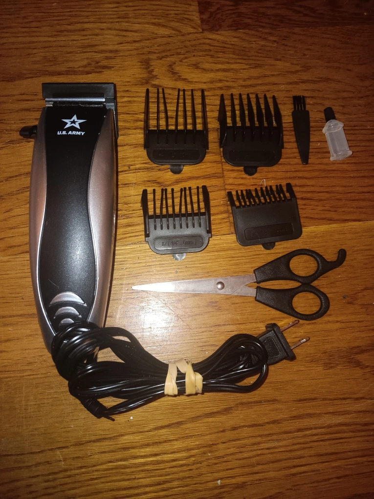 Selling a U.S. Army high quality professional hair clipper set. It features an ergonomic body design for comfort and an adjustable speed motor. It has low noise and an adjustable blade lever. Accessories include cutting guards, blade cleaning oil, cleaning brush, a comb, scissors, and a plastic blade cover.