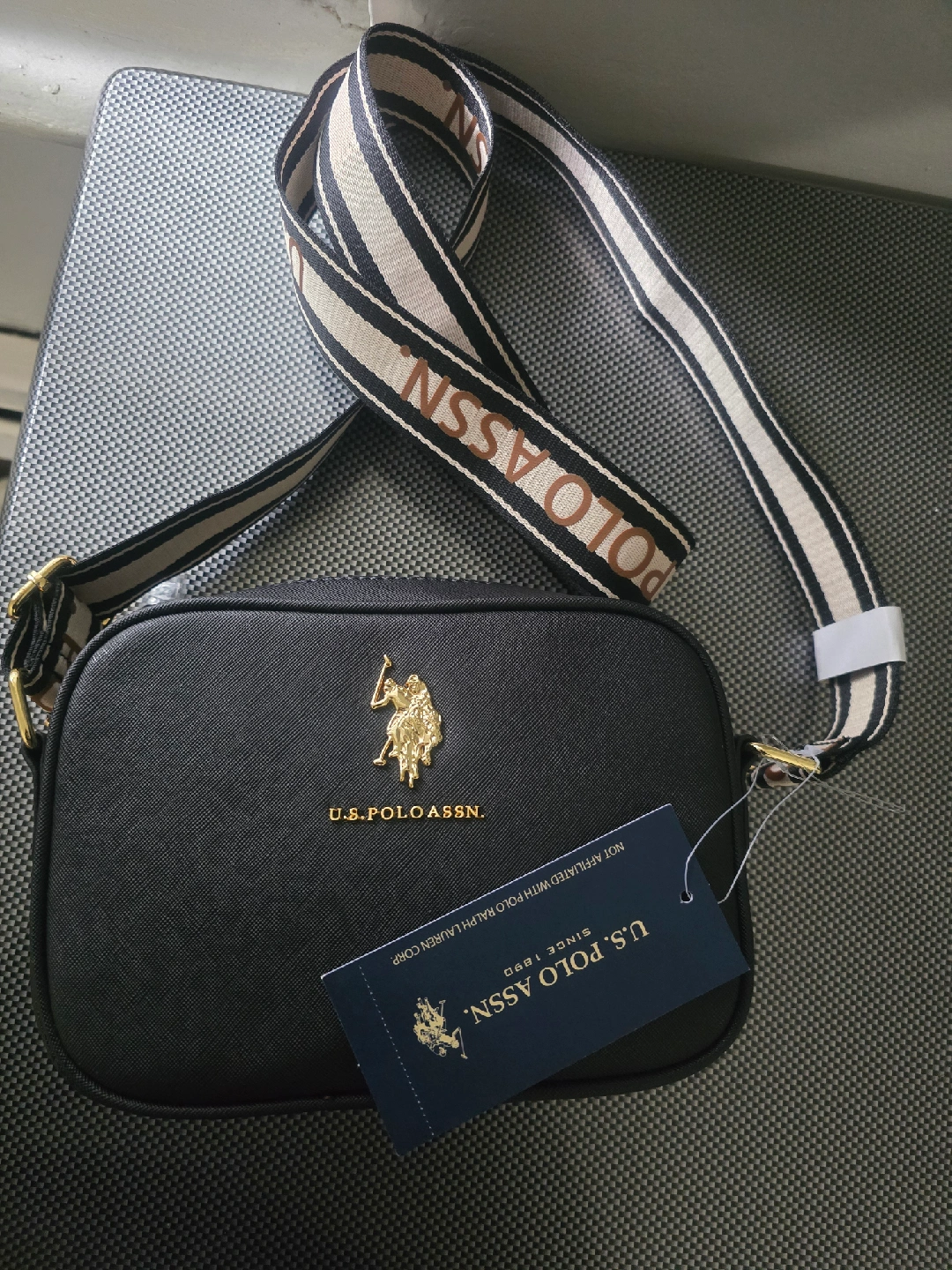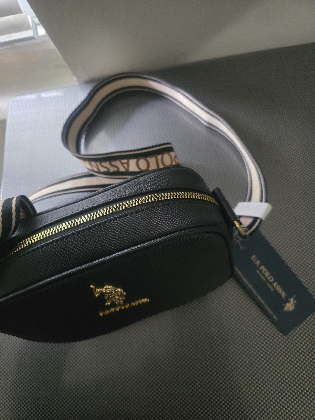 10Selling a stylish U.S. Polo Assn. crossbody bag in black! It features a unique strap with the brand's name on it and a gold logo on the front. Perfect for carrying your essentials in style