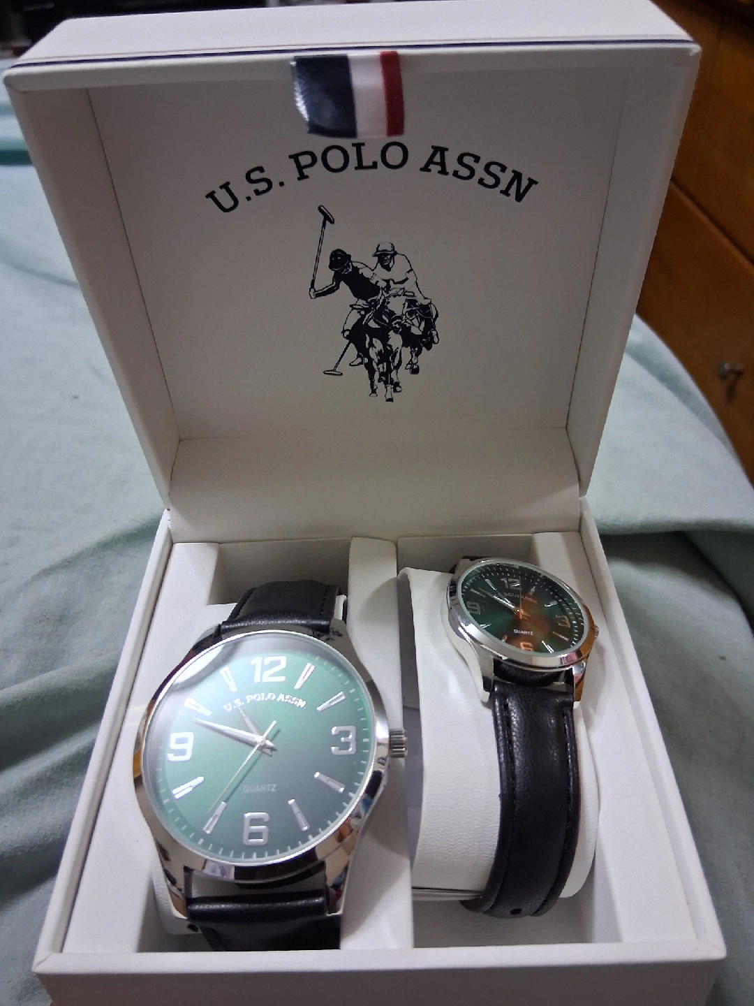 Selling a U.S. Polo Assn. watch set that comes with its original box! The set includes two watches with black leather straps and green faces. One watch has a larger face with numbers, and the other is slightly smaller. Both are quartz watches and in great condition