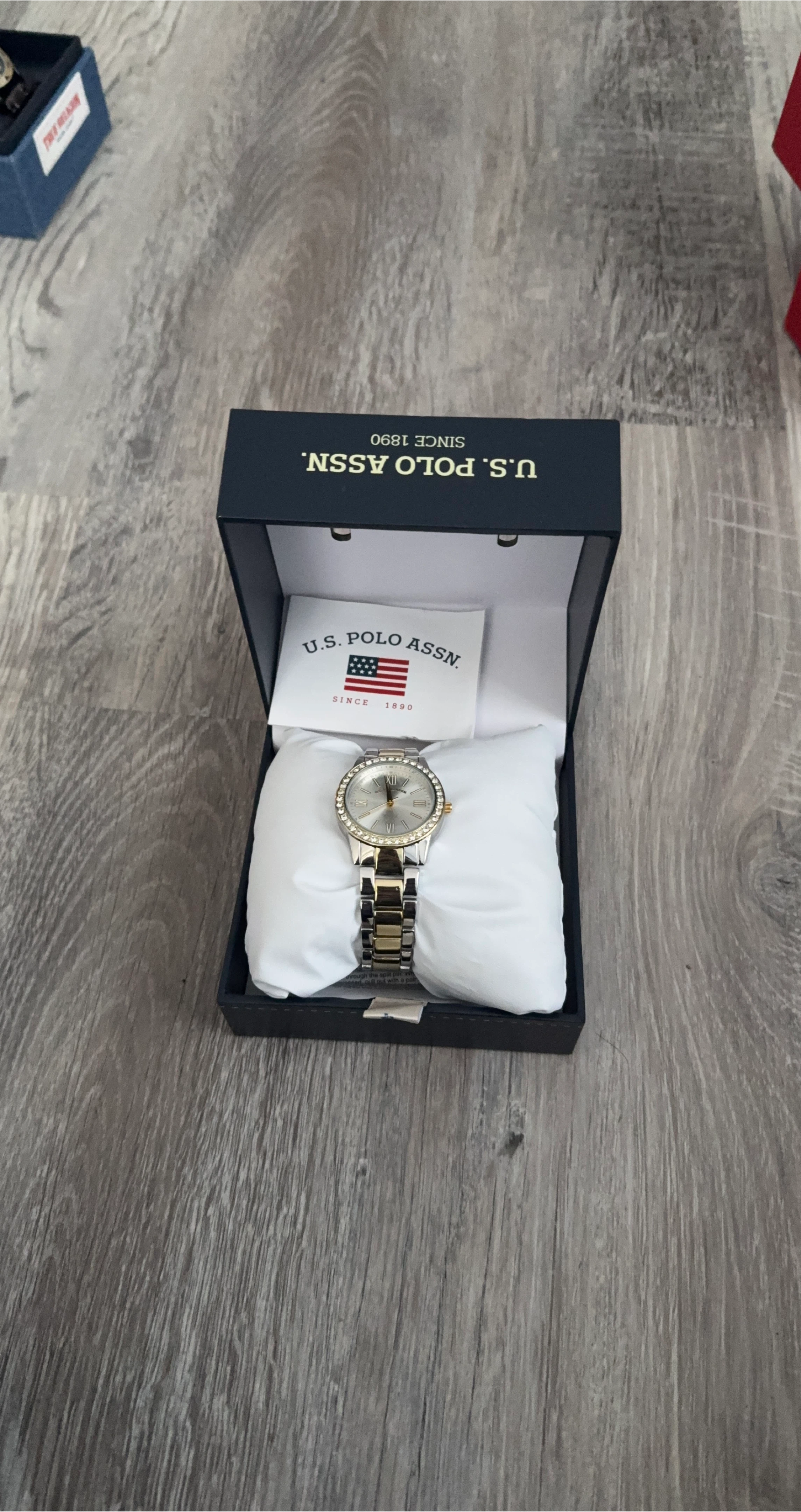 Selling a U.S. Polo Assn. women's watch. It comes with its original box. The watch features a silver and gold-tone band and a crystal-accented bezel. Perfect for adding a touch of sparkle to your everyday look!