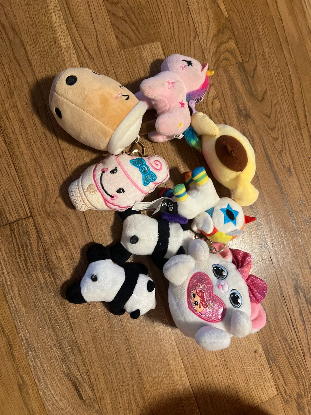 Set of six small plush keychains featuring cute designs like a unicorn, panda, boba tea cup, and more. Each plush has a different character! Perfect for adding a fun touch to bags or backpacks.