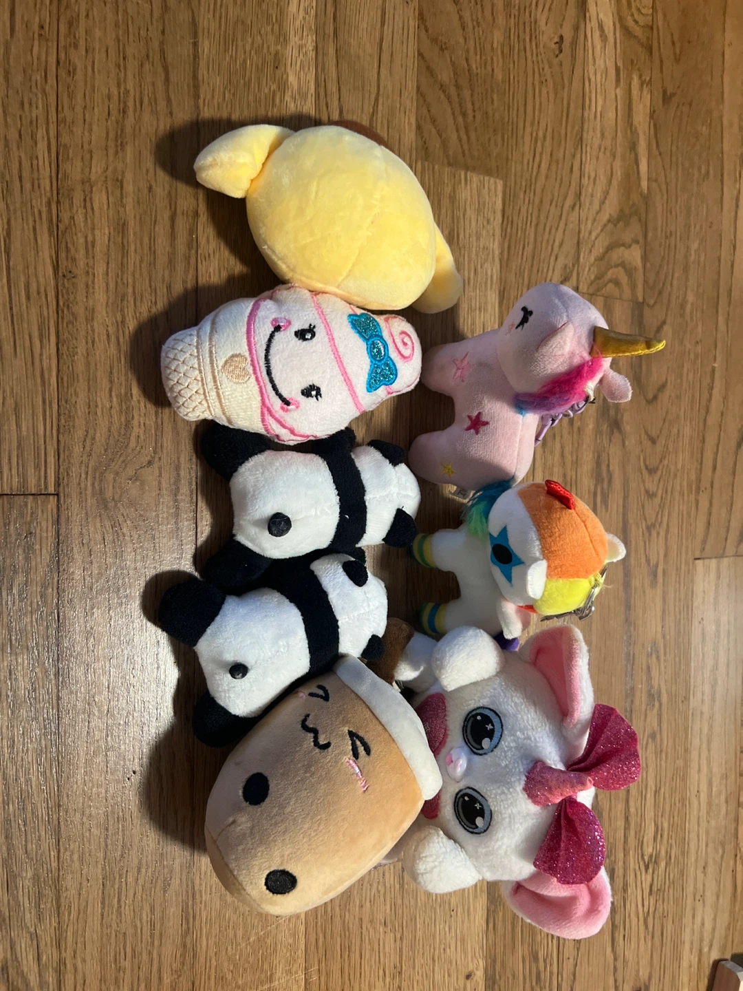 Set of six small plush keychains featuring cute designs like a unicorn, panda, boba tea cup, and more. Each plush has a different character! Perfect for adding a fun touch to bags or backpacks.