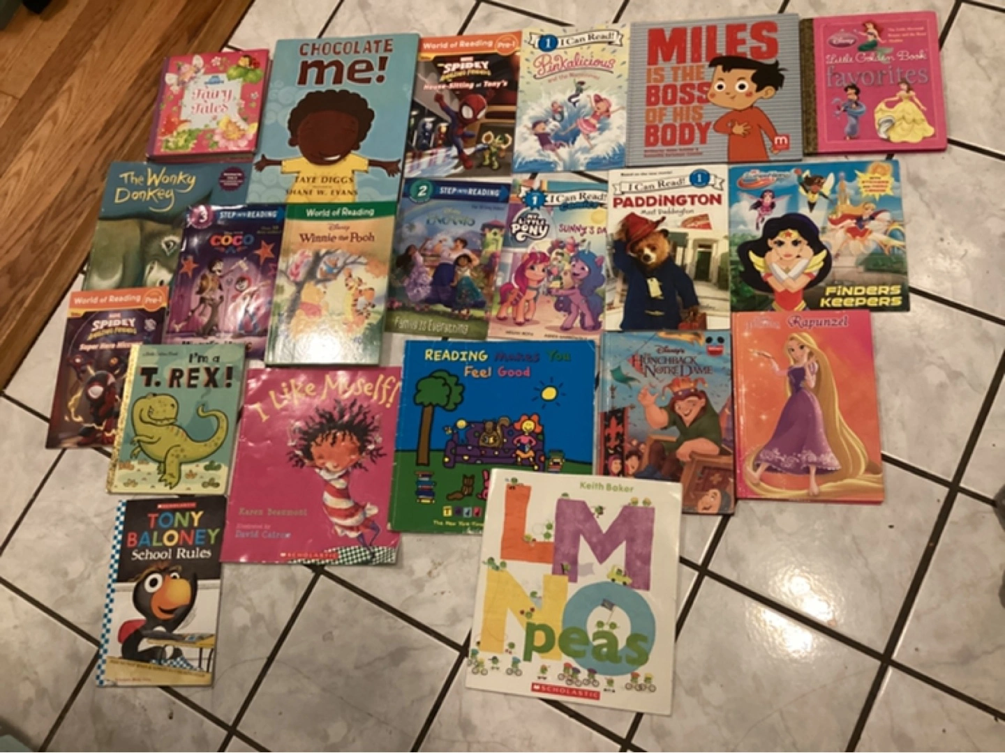 Collection of children's books. Includes Disney titles, Paddington Bear, Miles, and more. Various reading levels. Great for kids!