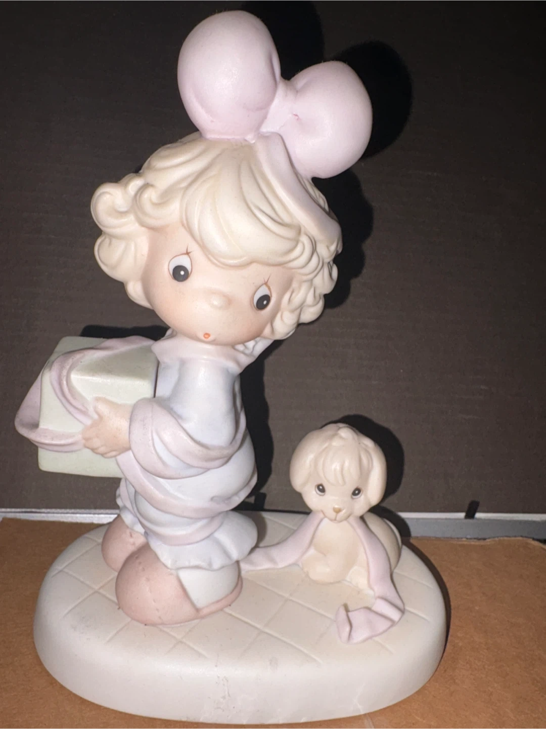 This is a sweet Precious Moments figurine of a girl holding a gift with a puppy by her side. It's in good condition and would be a lovely addition to any collection