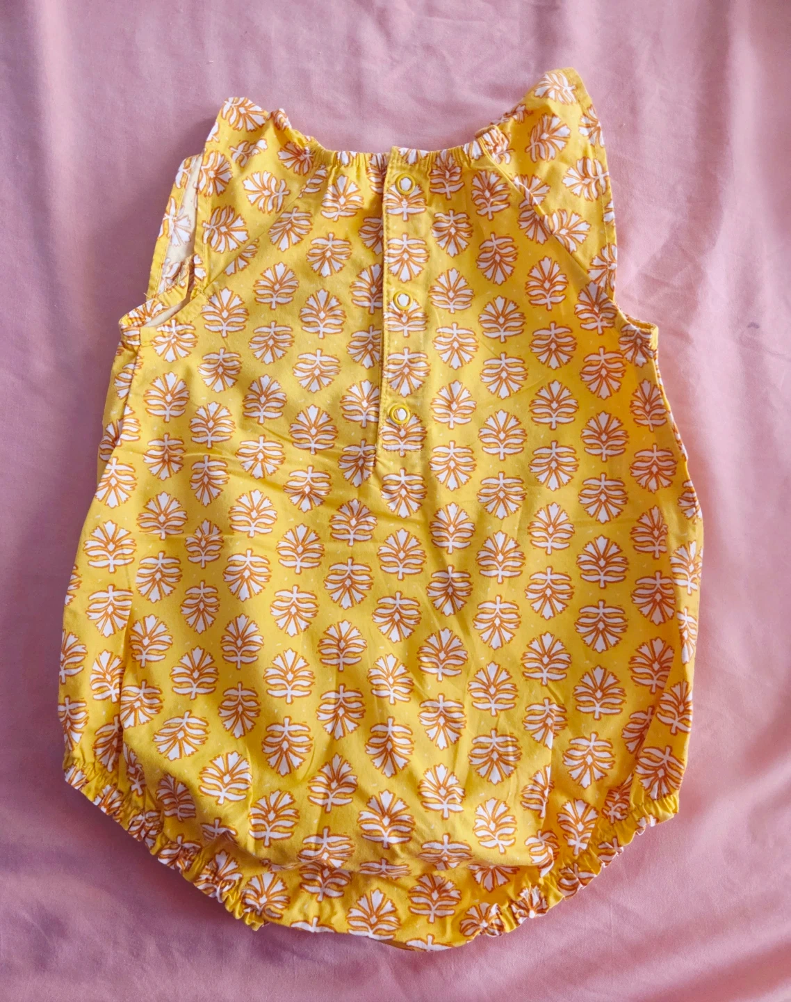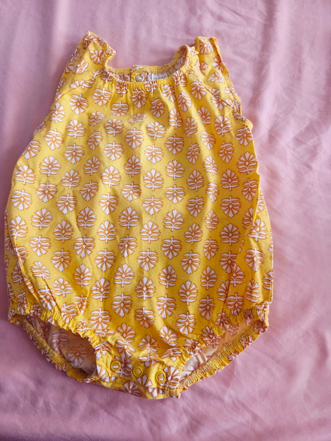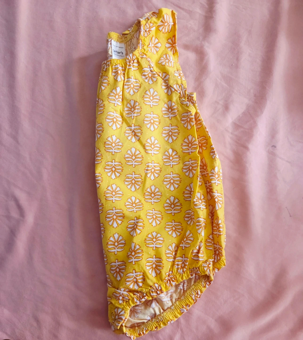 This adorable Carter's baby girl romper features a bright yellow color with a white and orange floral pattern. It's sleeveless with a button-down back and snaps at the crotch for easy changes. A comfortable and cute outfit for your little one!