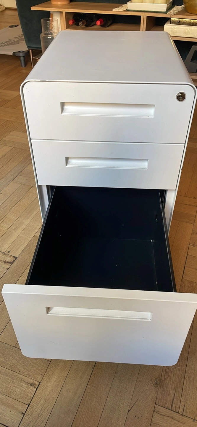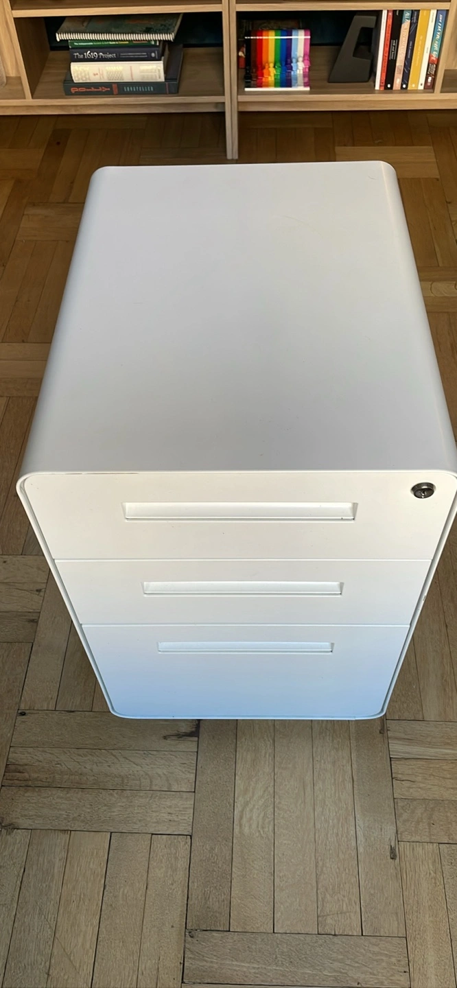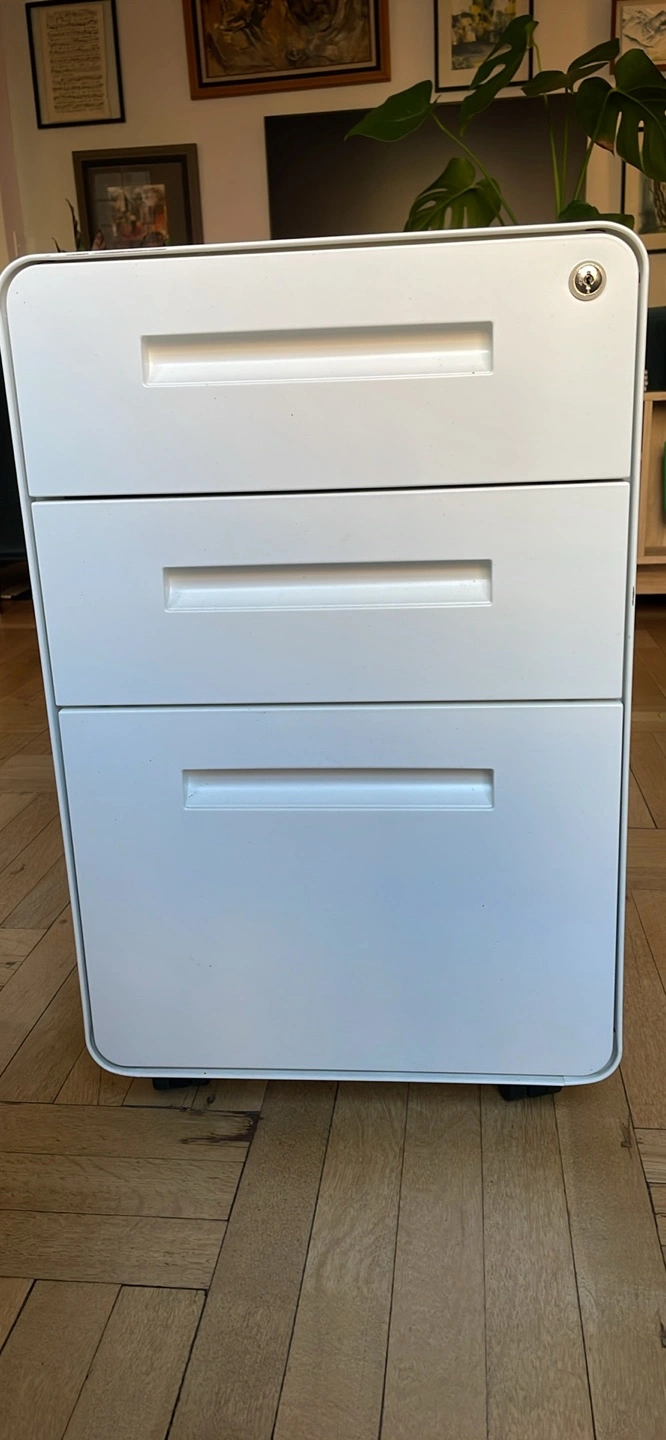 White filing cabinet with three drawers in great condition. Dimensions:. Top drawer locks, keys included. It has lockable wheels with the option to switch out for adjustable height flat feet.