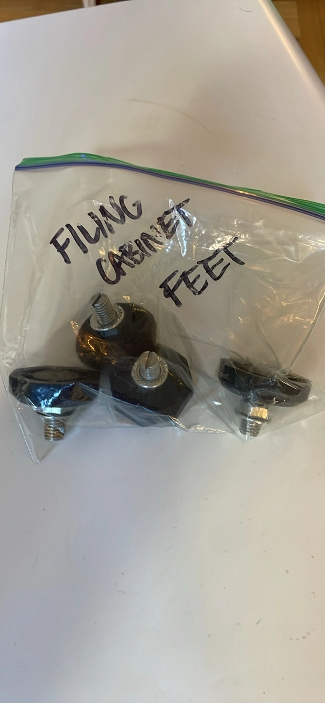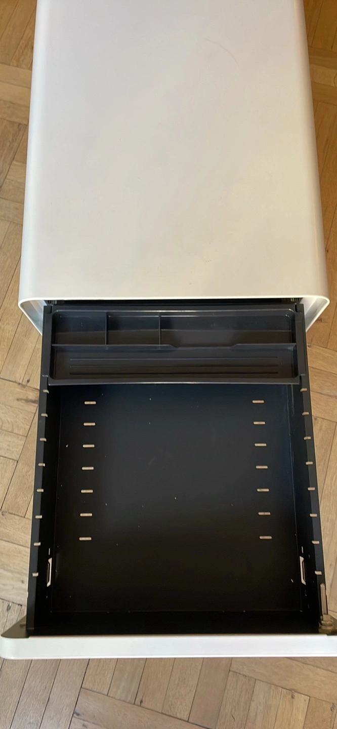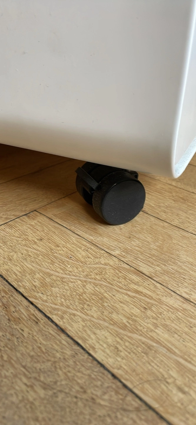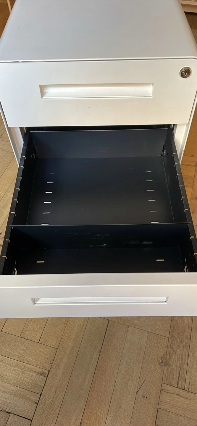 White filing cabinet with three drawers in great condition. Dimensions:. Top drawer locks, keys included. It has lockable wheels with the option to switch out for adjustable height flat feet.