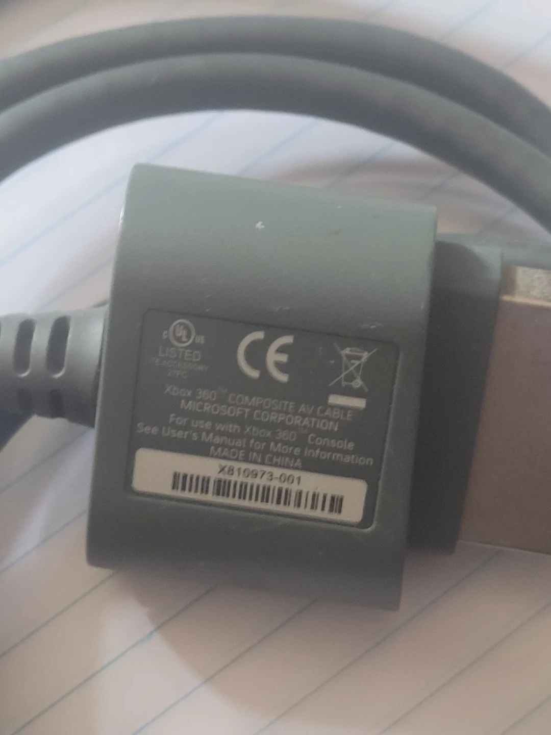 This is a Microsoft Xbox 360 Composite AV cable. It's designed for use with the Xbox 360 console. Includes RCA connectors for audio and video.