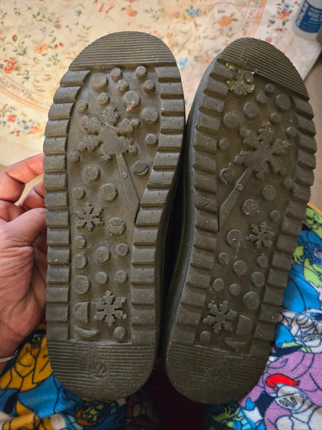Cozy black winter boots featuring a plush faux fur trim around the collar. These boots have a durable, slip-resistant sole with a snowflake pattern. They're designed for warmth and comfort in cold weather.