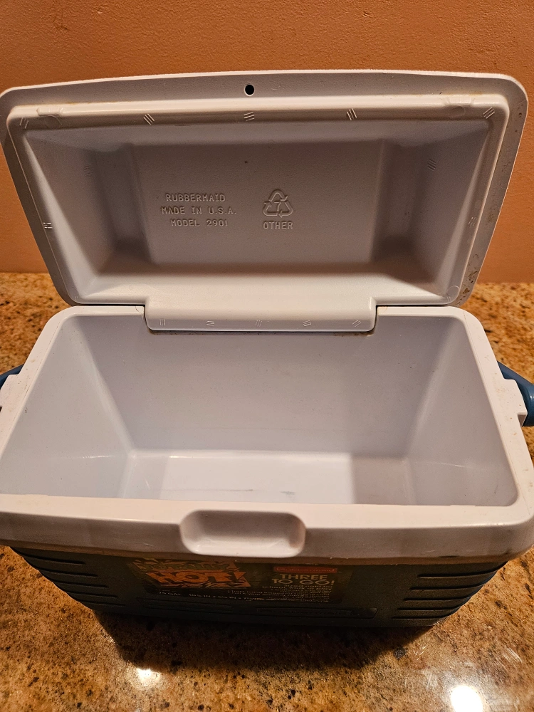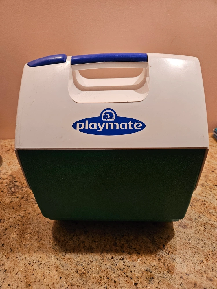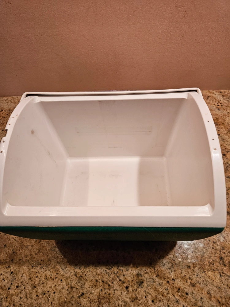 Exterior in white and green. A lid with a handle in a matching color. Interior in white. Use this cooler for a peaceful day at the park.