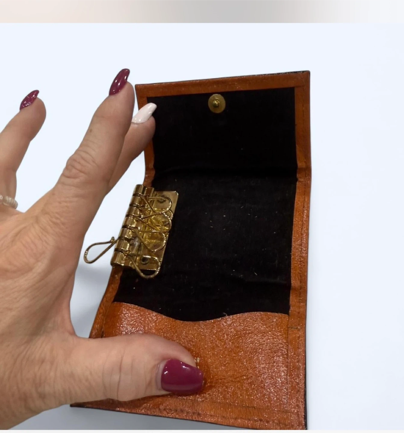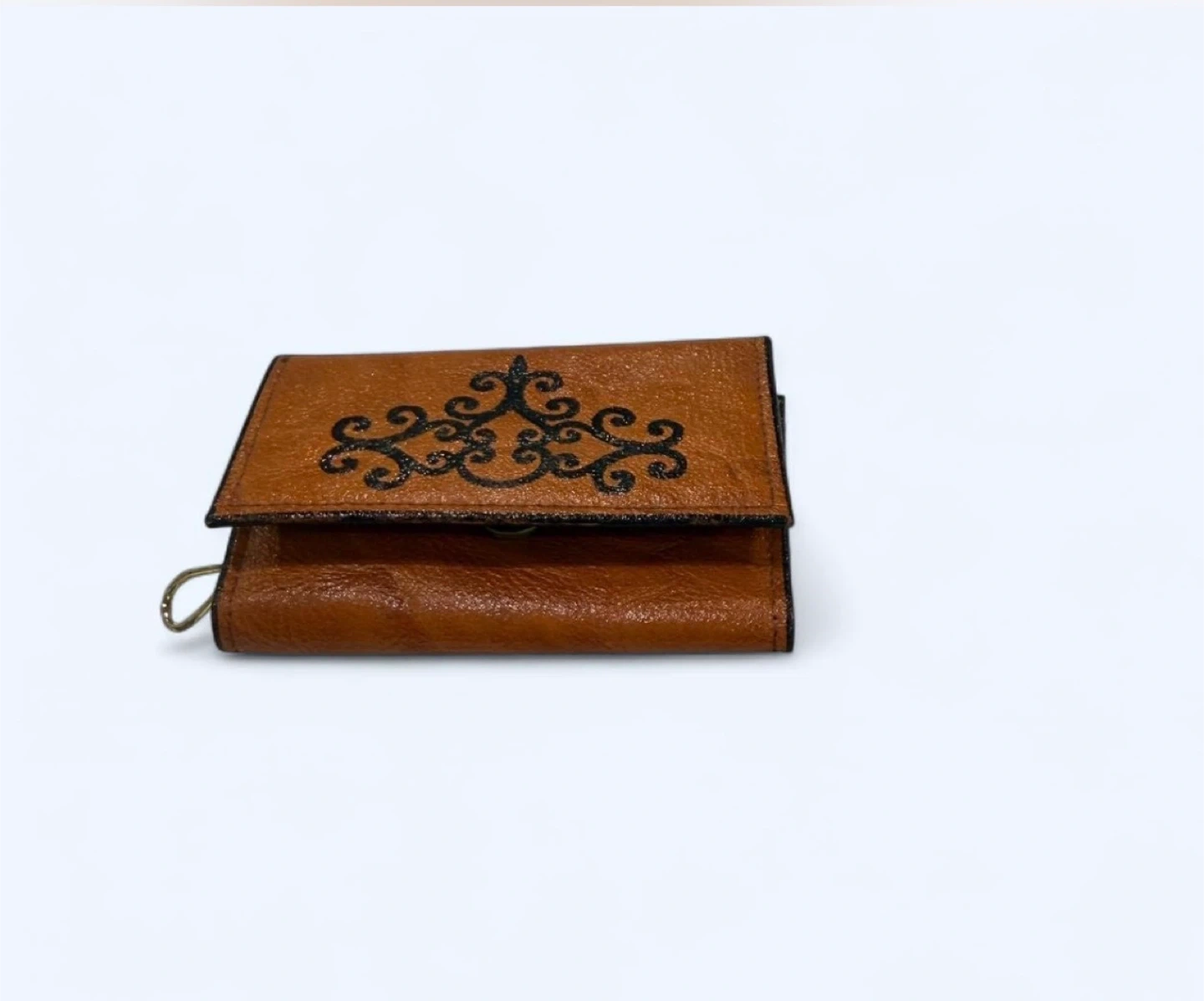 This tri-fold wallet is crafted from brown leather and features an ornate black design on the flap. It includes a key organizer inside with a snap closure. It's perfect for keeping your essentials organized on the go!