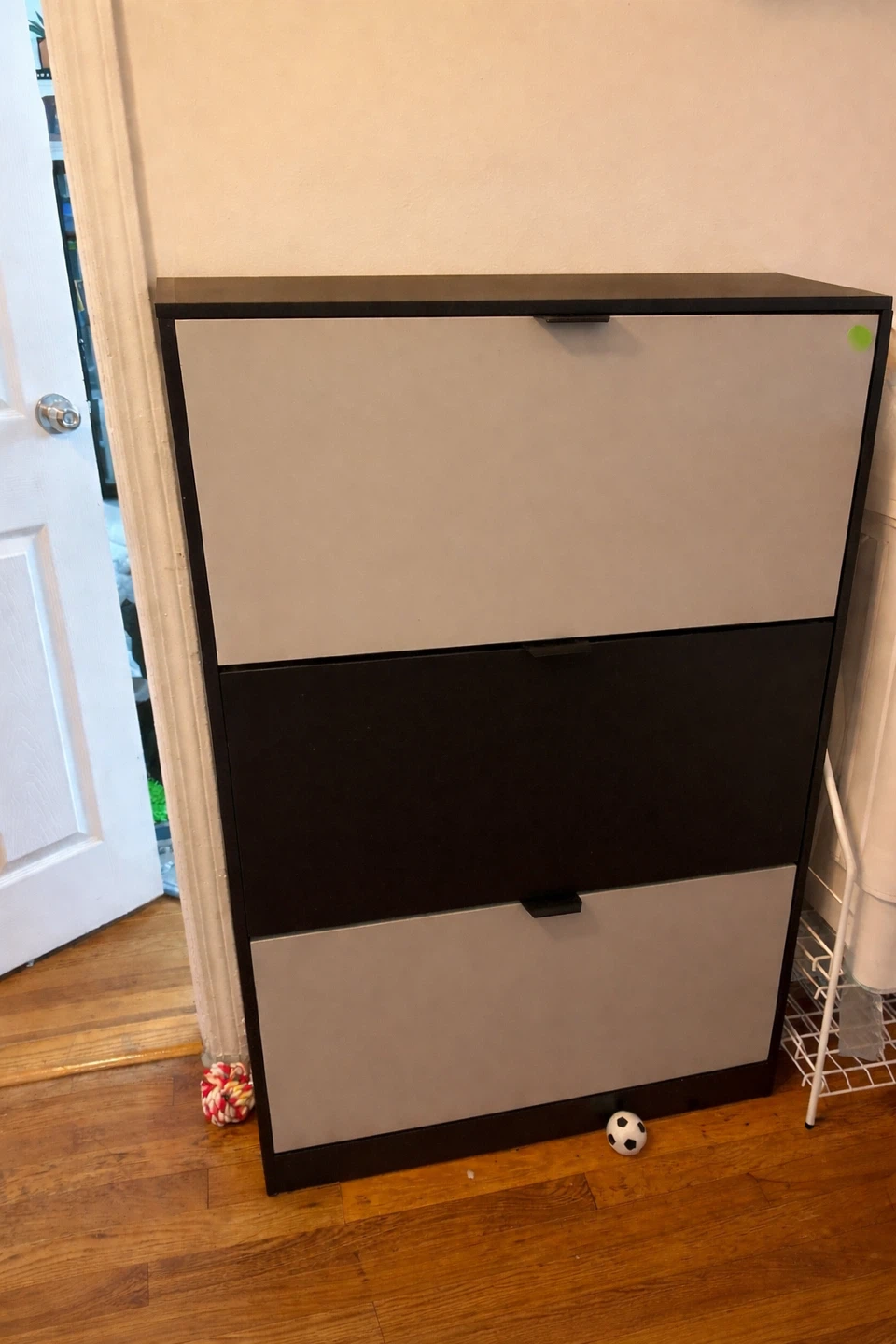 This shoe cabinet has three flip drawers for organized storage. It's a practical solution for entryway clutter. The cabinet has a modern two-tone design in black and gray. It's great for keeping shoes neatly stored and out of sight.