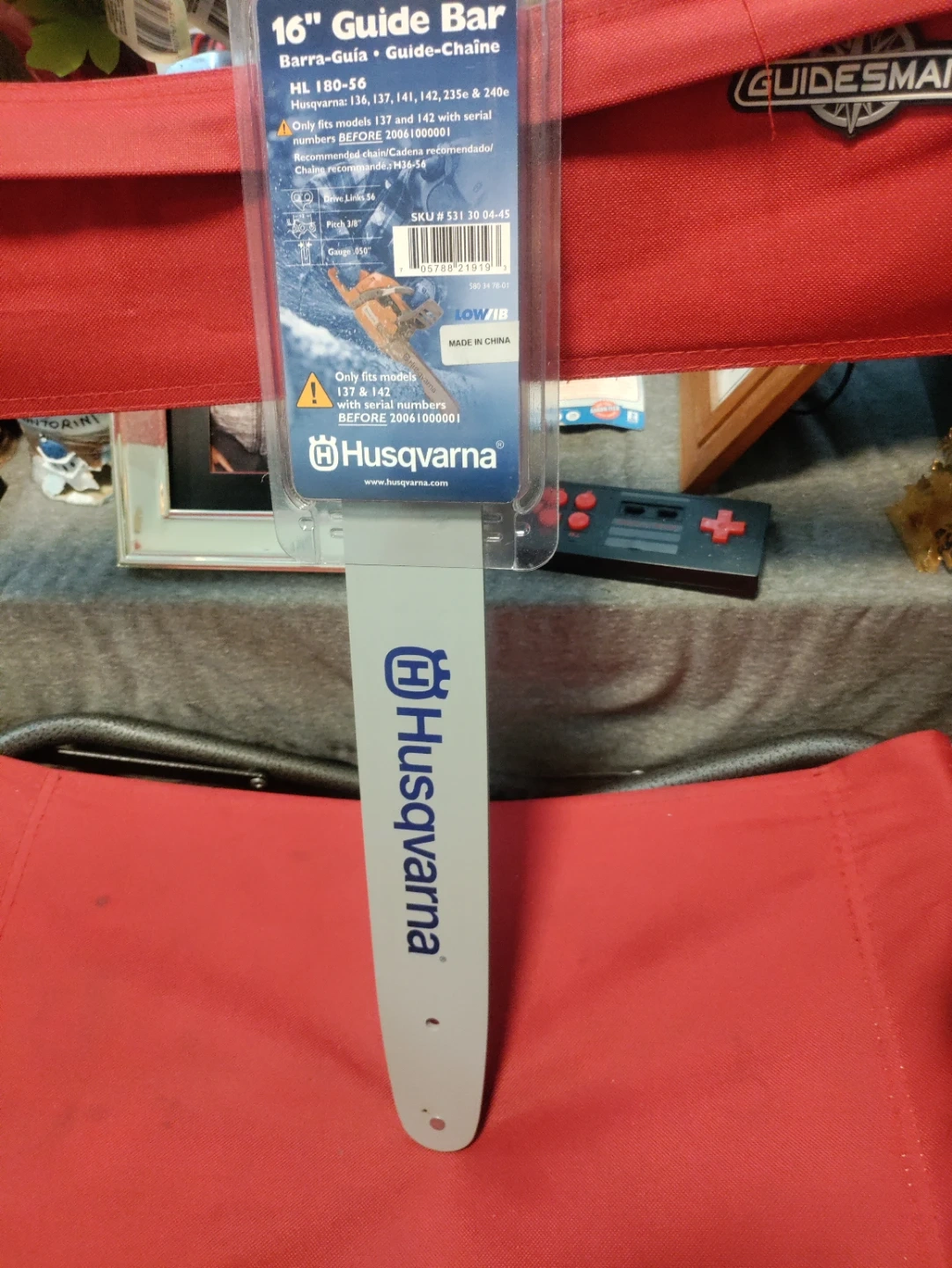 This is a 16-inch Husqvarna guide bar, model HL 180-56. It has 56 drive links and a 3/8" pitch with a .050" gauge. It's made in China.