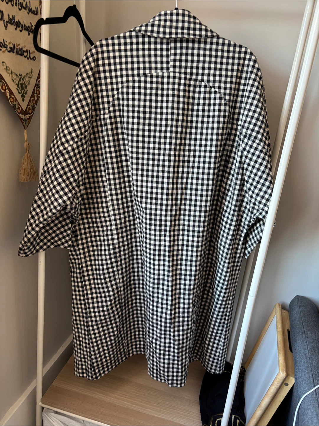 Chic Jaffa trench coat with a classic black and white gingham pattern. Features a white lining and button closure. 100% cotton material.