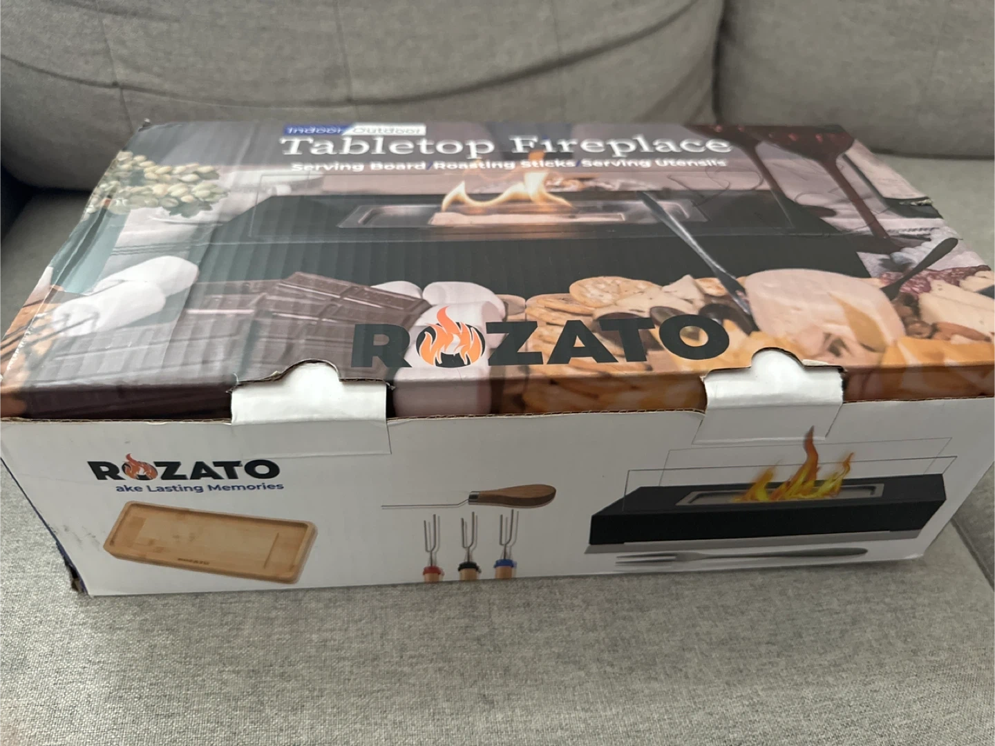 This is a Rozato tabletop fireplace for indoor and outdoor use. It includes a serving board and roasting sticks. It's designed for serving snacks and roasting marshmallows.