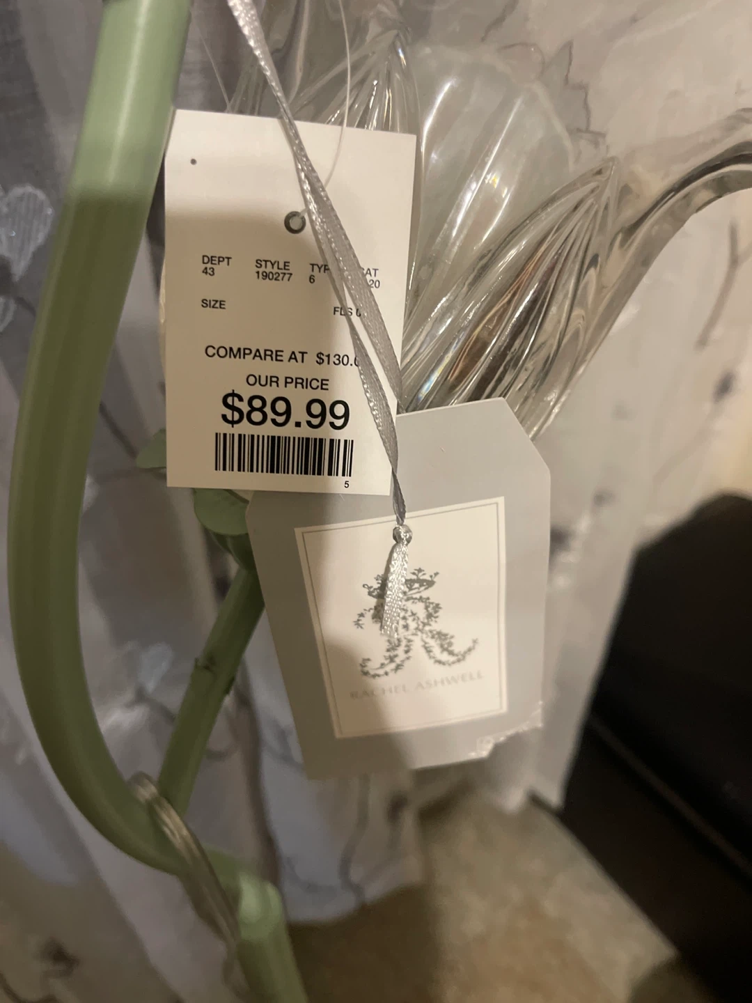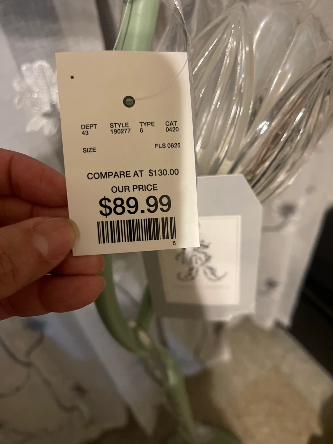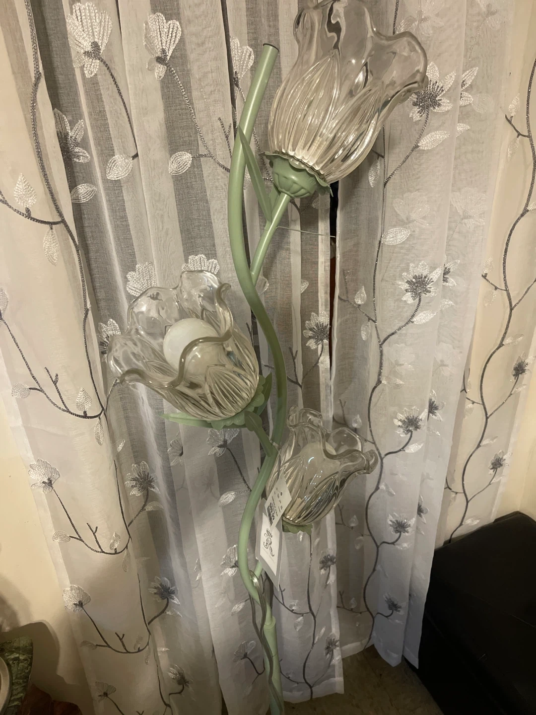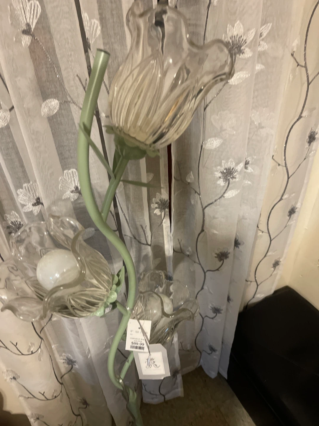 This elegant floor lamp features a unique tulip design with clear glass shades. It's made with a light green metal stem. The lamp includes one bulb and has decorative glass shades. Great for adding a touch of whimsy to any room!