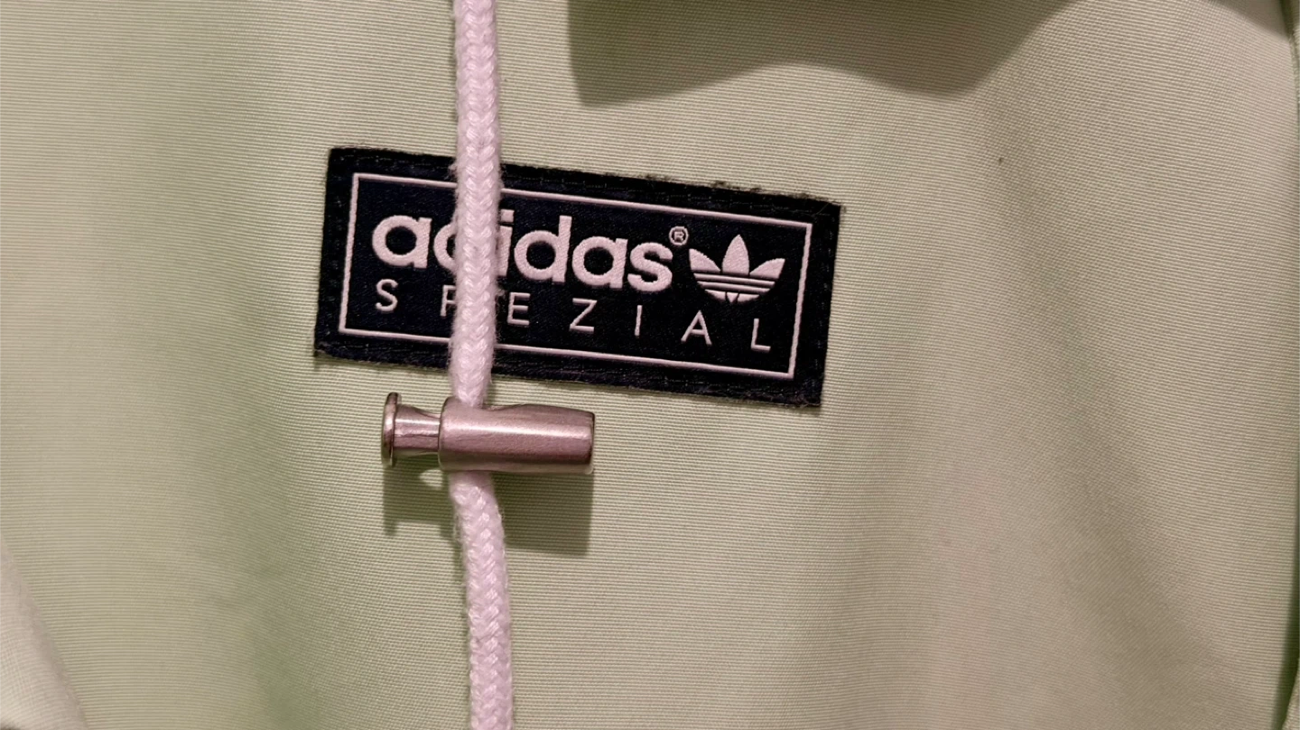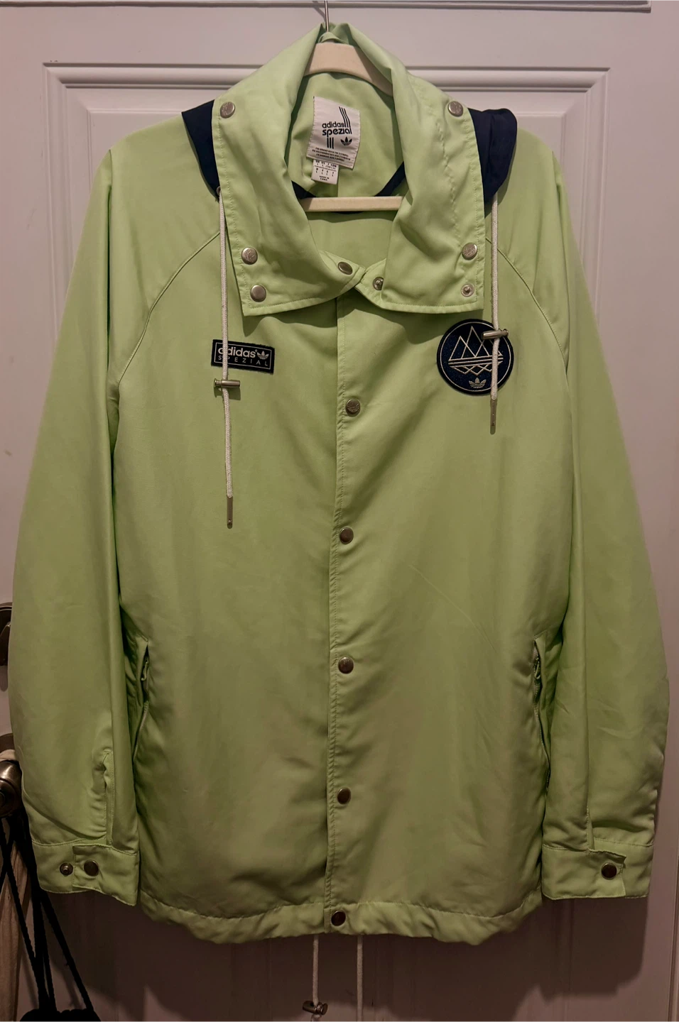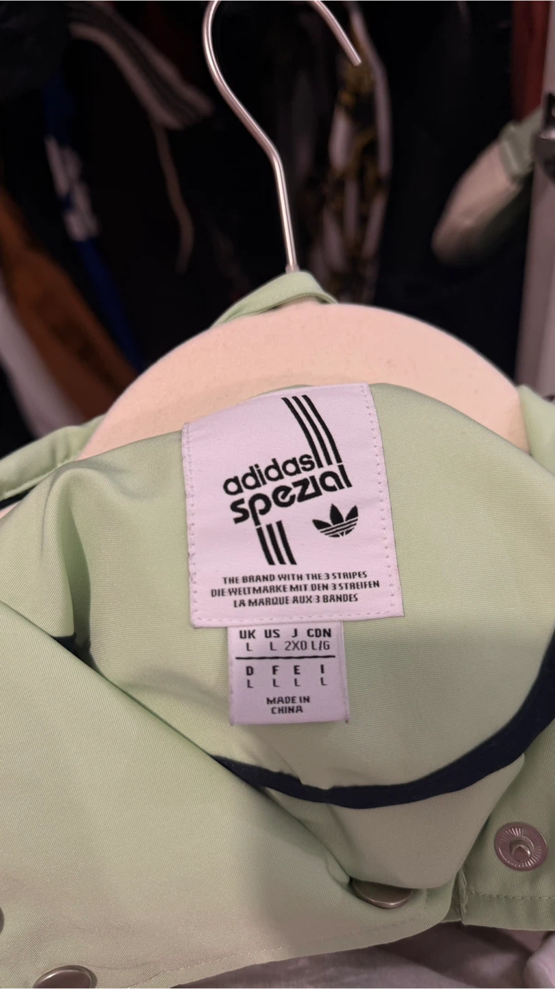 Adidas Spezial jacket in a light green color. Features a snap button closure and a navy blue hood. Includes an interior drawstring at the hem for an adjustable fit.
