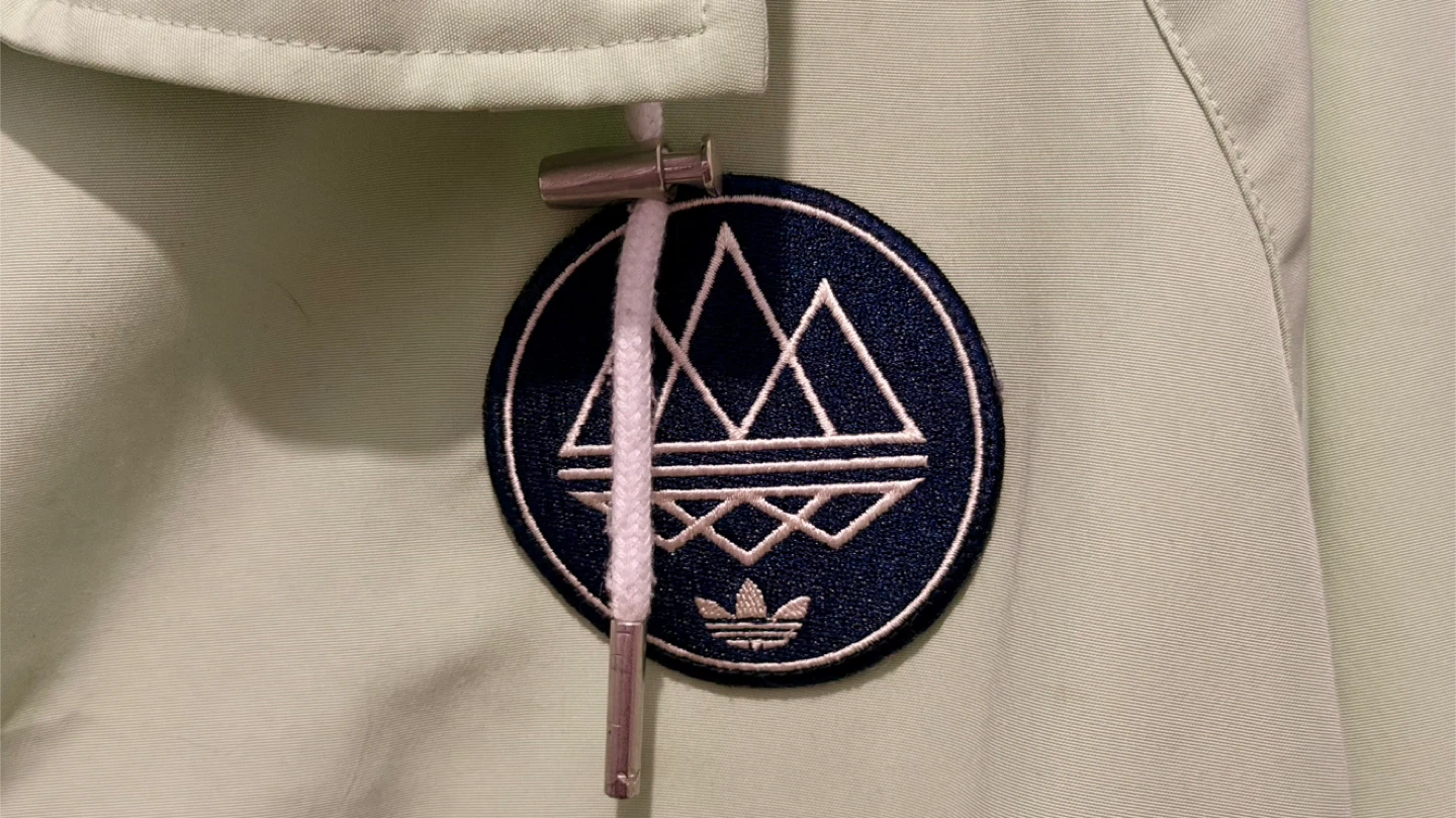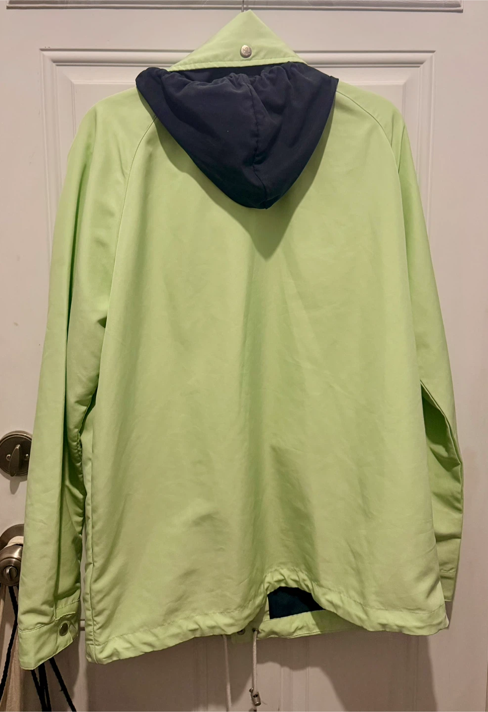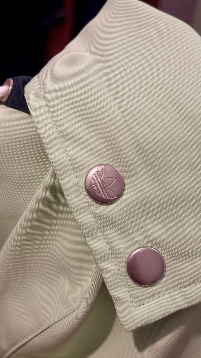 Adidas Spezial jacket in a light green color. Features a snap button closure and a navy blue hood. Includes an interior drawstring at the hem for an adjustable fit.