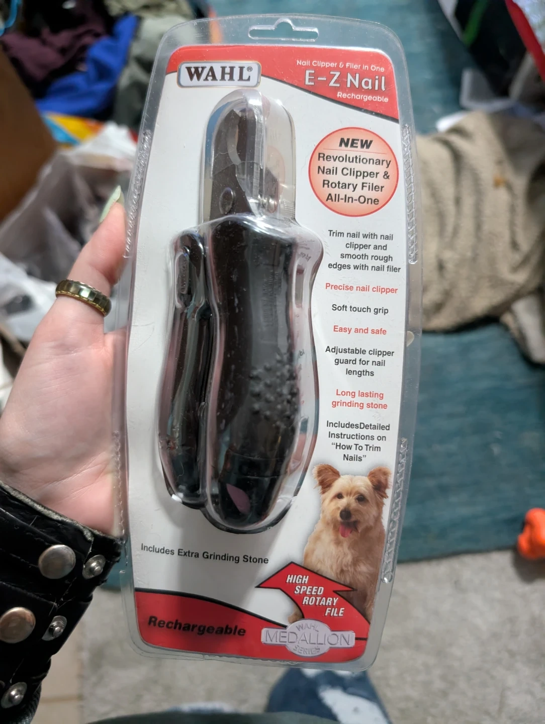 It's a revolutionary nail clipper and rotary filer all-in-one! It helps to trim nails with nail clipper and smooth rough edges with rotary filer. There is a switch on the handle (approx. where your thumbtip will be while operating the clipper); you just slide that switch to toggle the rotary grinder off/on. The protective cap over the grinder also rotates (manually), so you can conveniently cover the grinder when not in use and expose it for nail access. The unit includes an adjustable clipper guard to accommodate all nail lengths. Charger cord and detailed instructions on how to trim pet nails are inside the package.