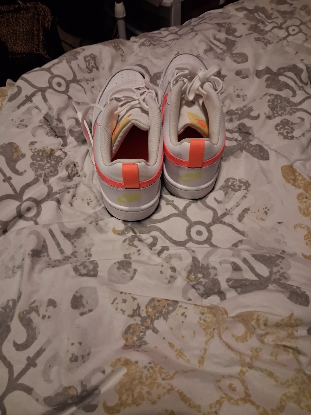White Nike Court Vision Low sneakers with coral accents. Features a classic lace-up design and a comfortable fit. These are great for everyday wear!