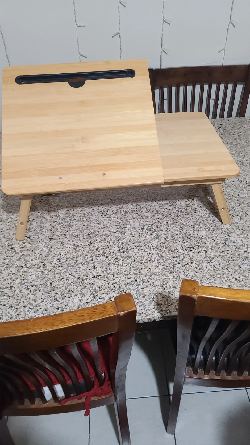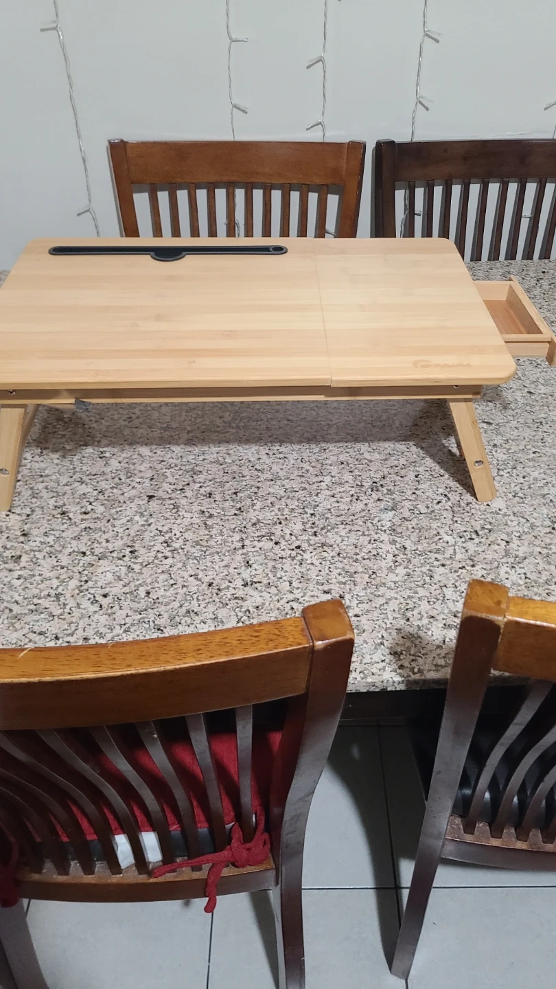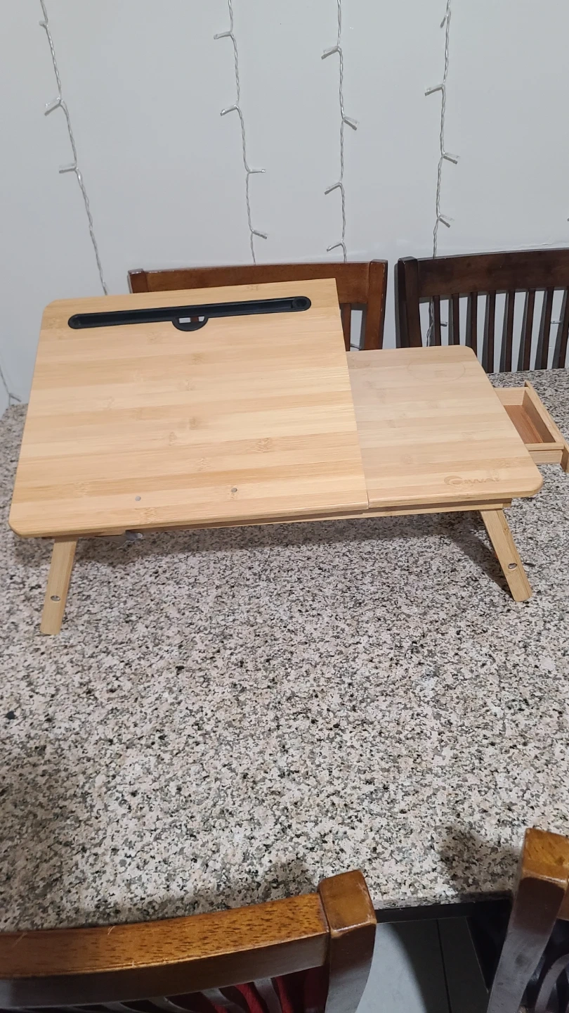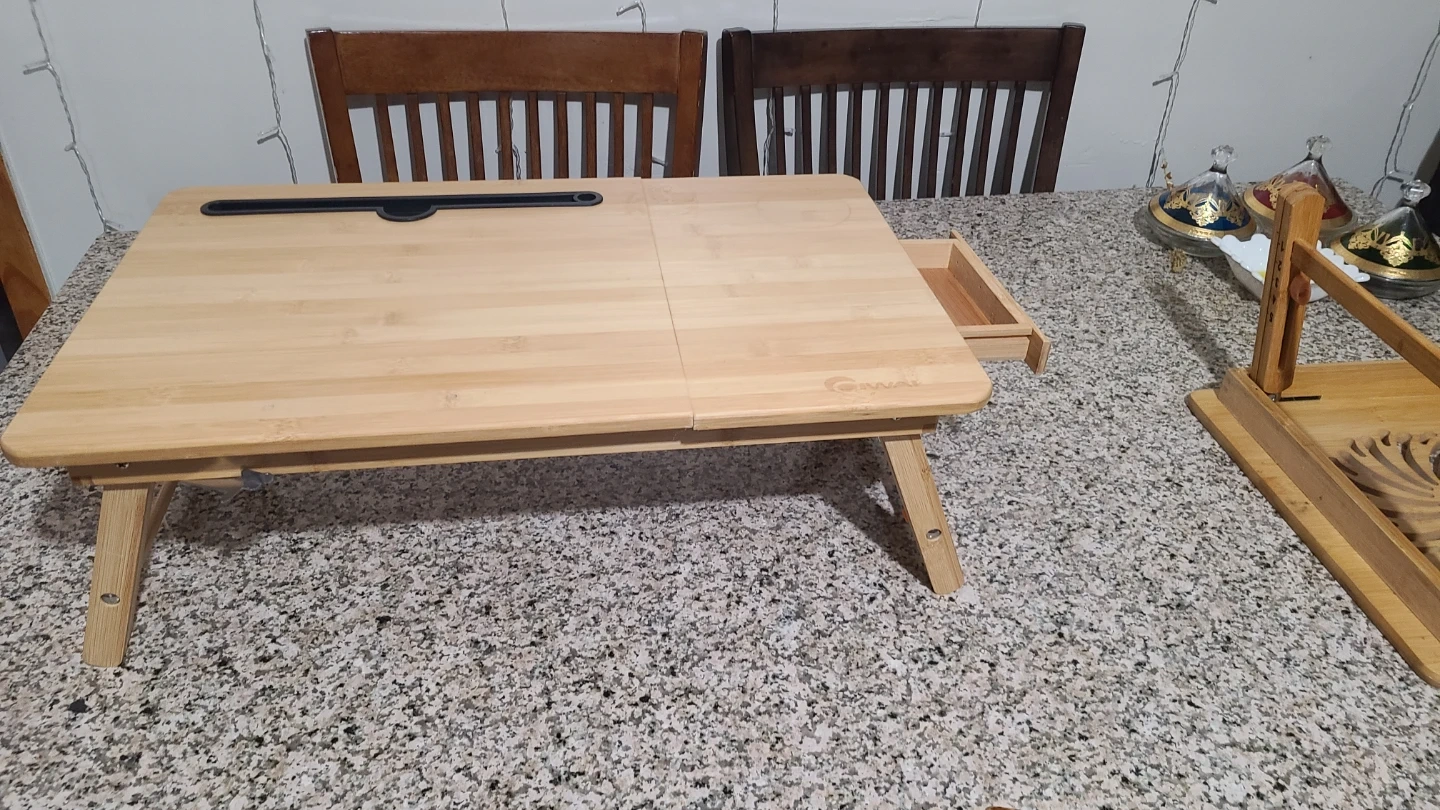 This bamboo lap desk offers a convenient workspace. It features a built-in drawer for small storage. The surface is adjustable and has a groove for a tablet or phone. It's perfect for working or relaxing anywhere!