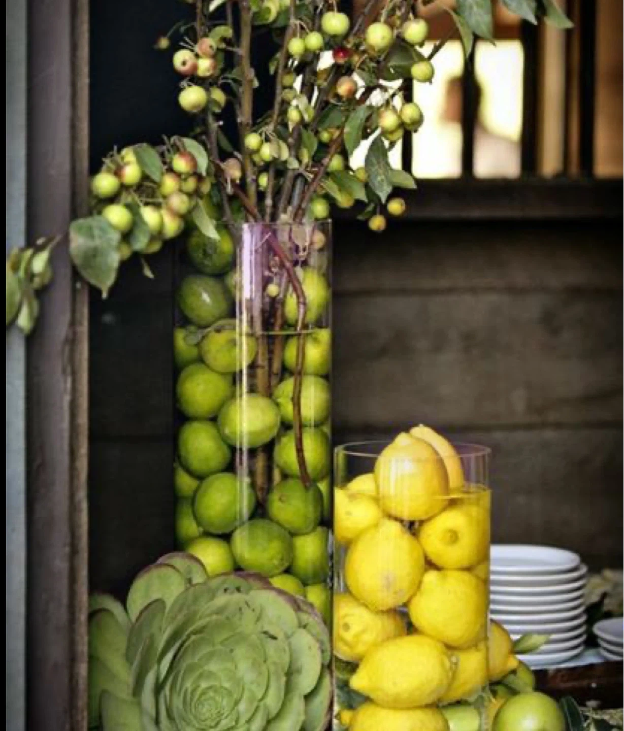 Two glass tumblers, one green and one yellow. They're perfect as flower vases or decorative pieces. Glass material. Want to create a statement piece, fill these vases with lemons and limes