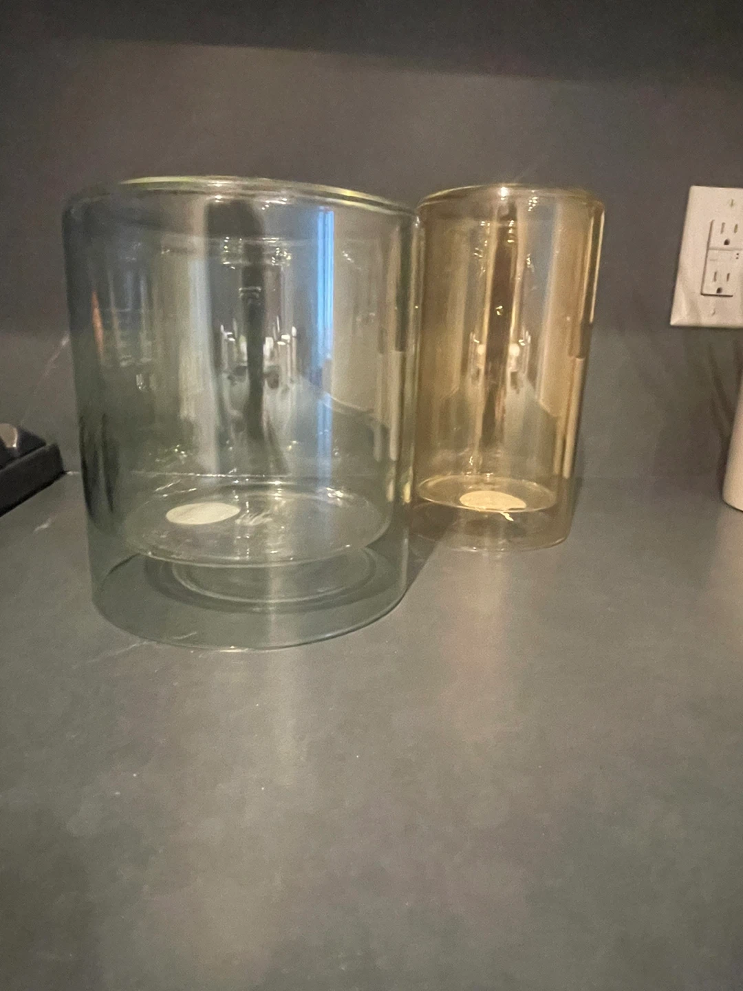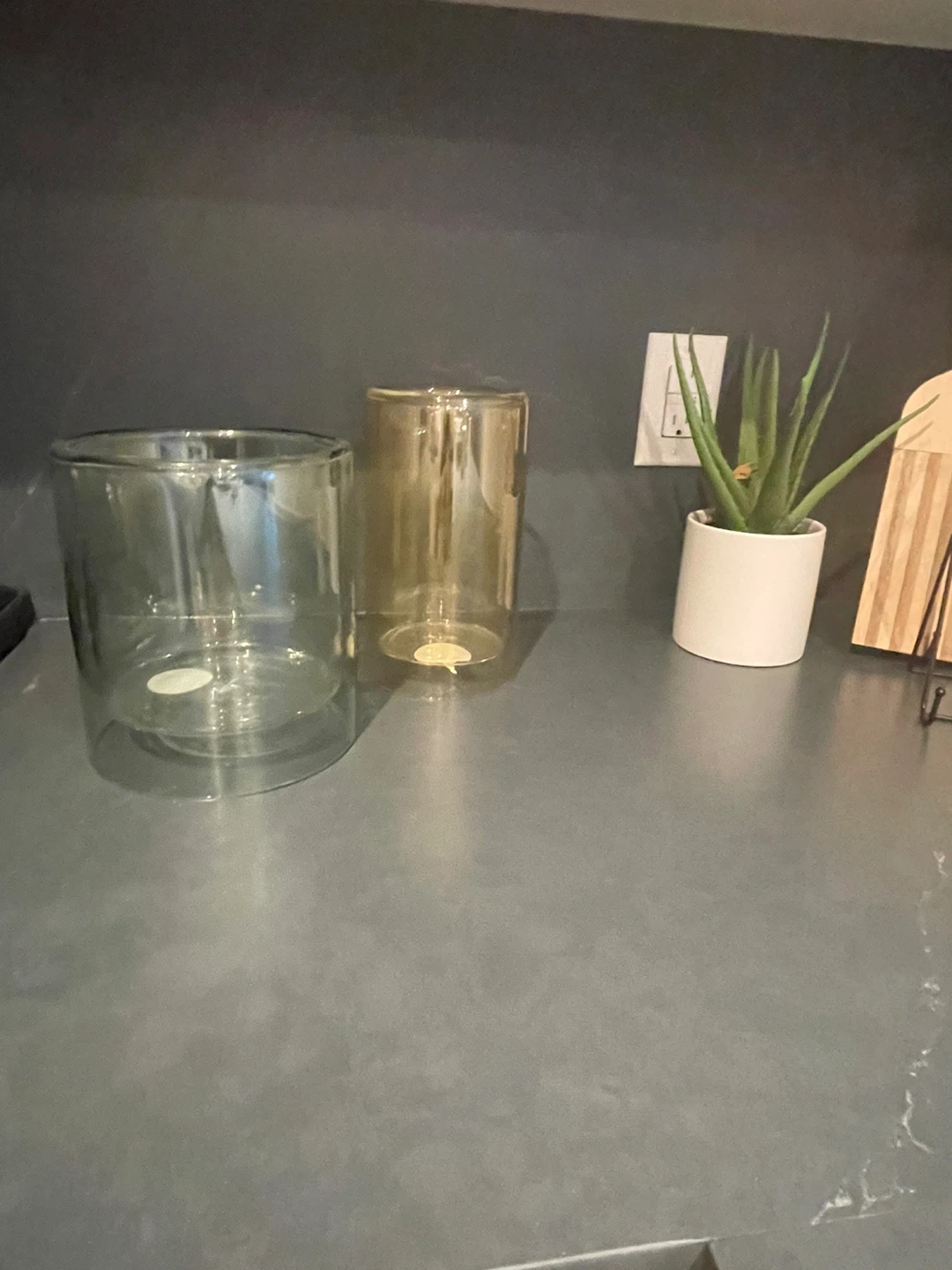 Two glass tumblers, one green and one yellow. They're perfect as flower vases or decorative pieces. Glass material. Want to create a statement piece, fill these vases with lemons and limes