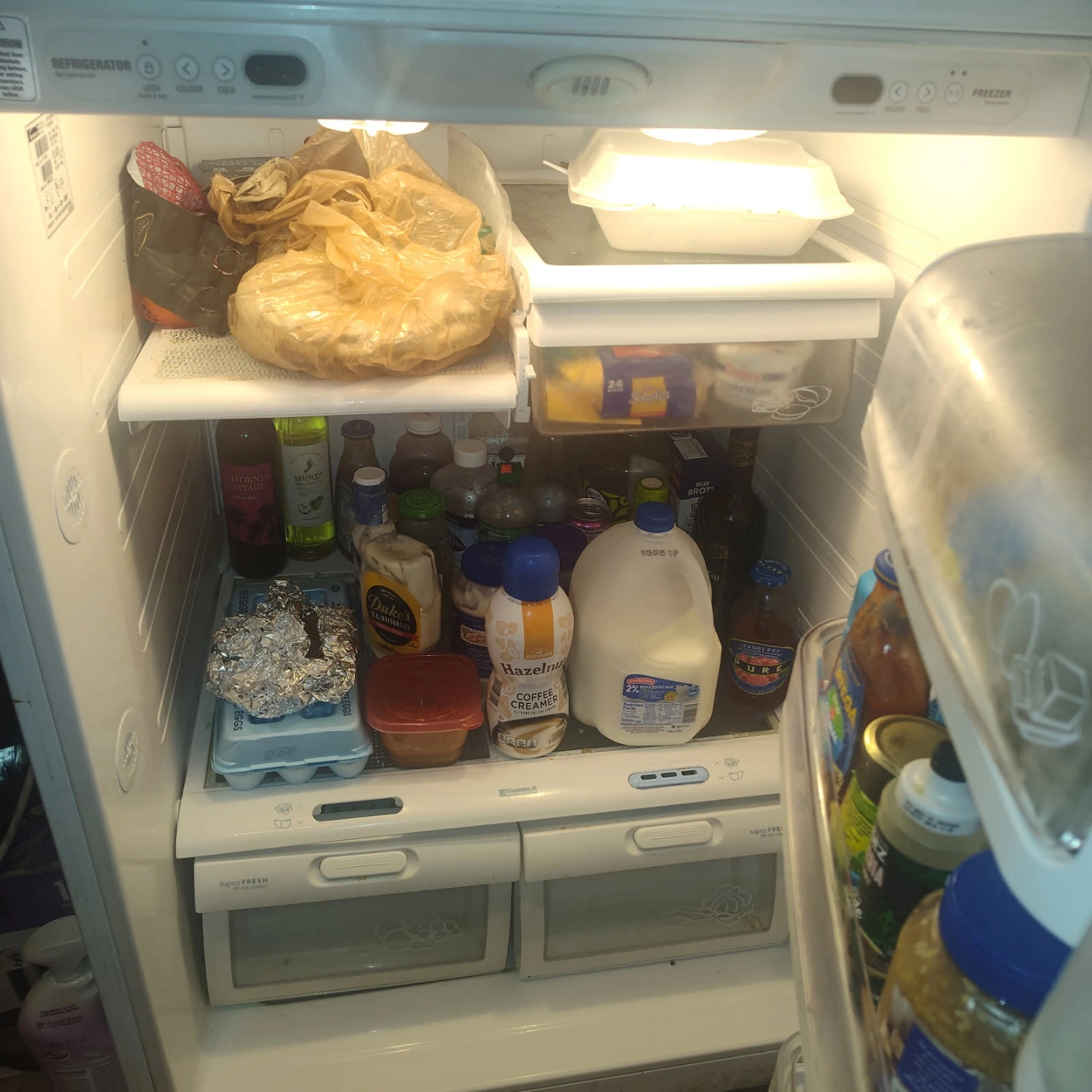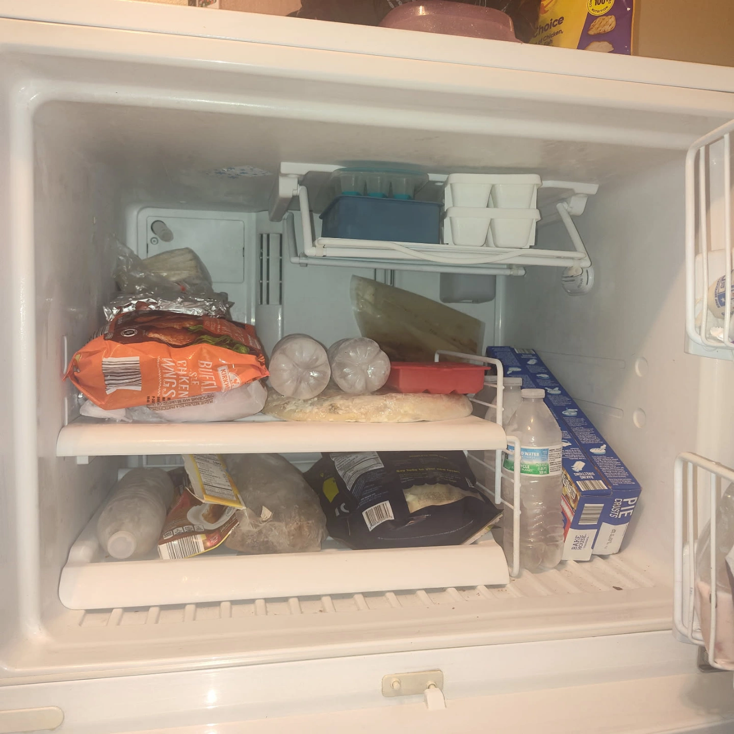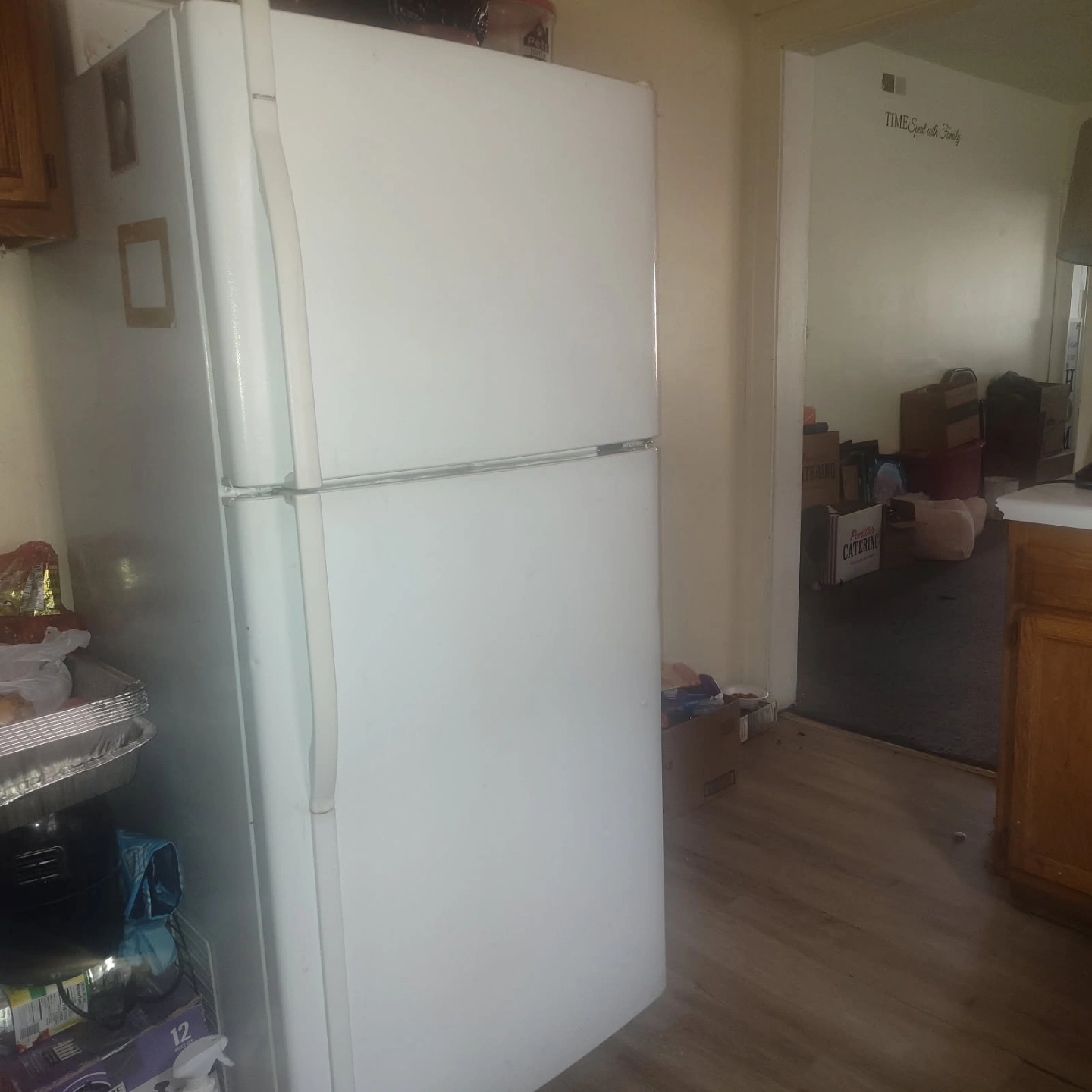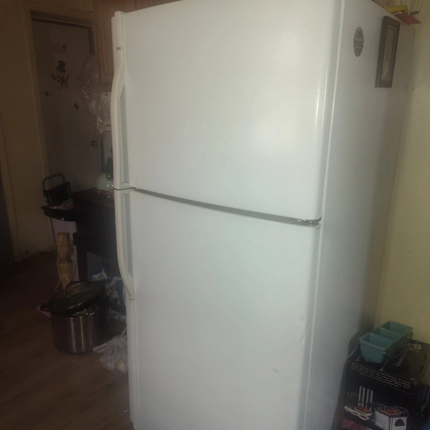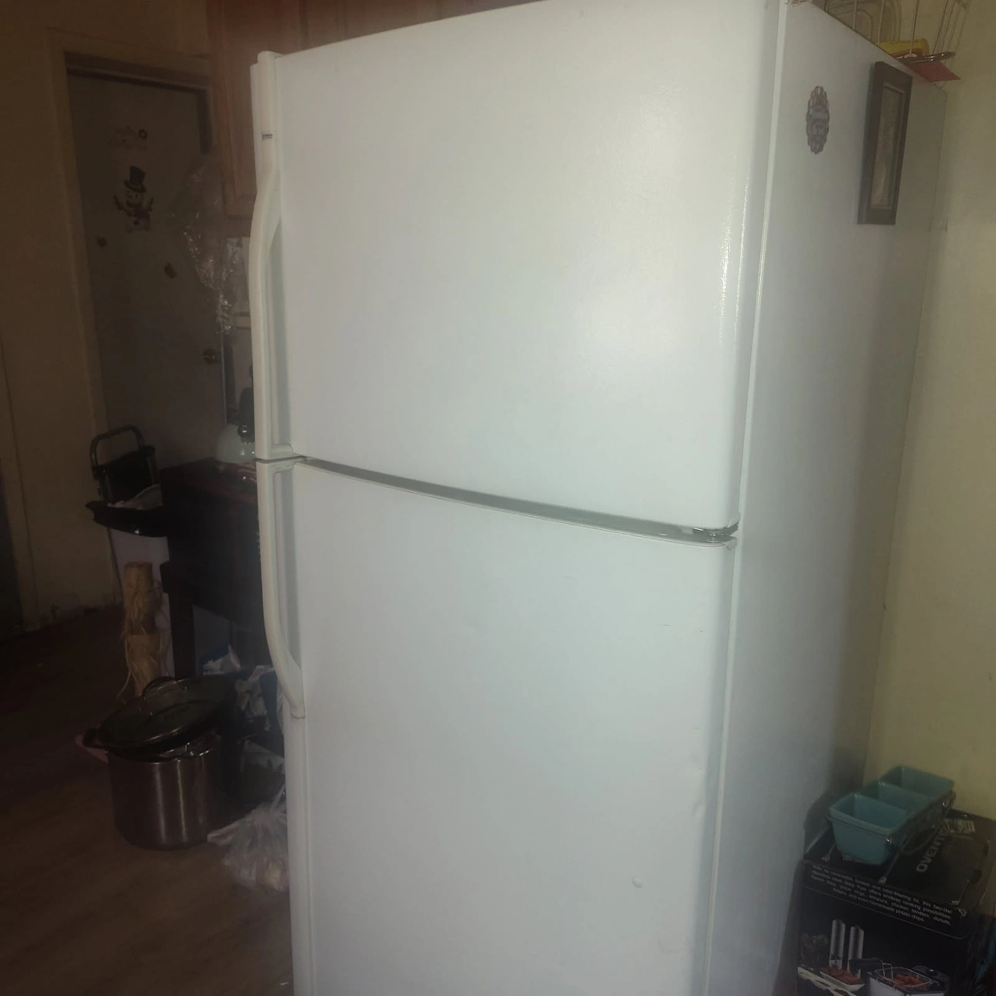 Used white top freezer refrigerator. Good working condition. Some minor cosmetic wear. Spacious interior. Includes adjustable shelves and crisper drawers. Great for a small apartment or dorm will be still plugged up when you come and get it that it works fine we'll be moving soon