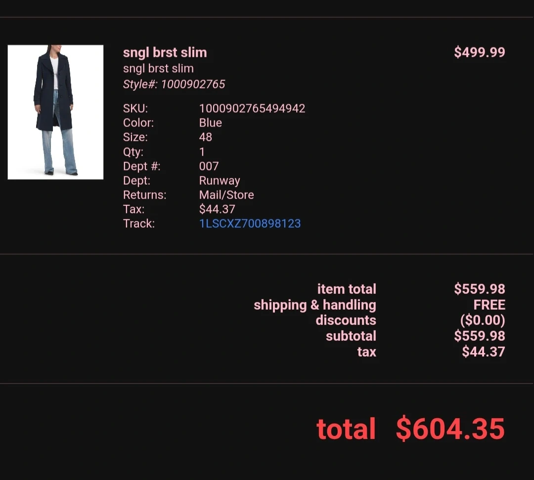 Selling a Sngl Brst Slim coat in navy blue, size 48! Style number is 1000902765. Originally bought for $499 tax in TJ Max runway. Regretfully too small for me
