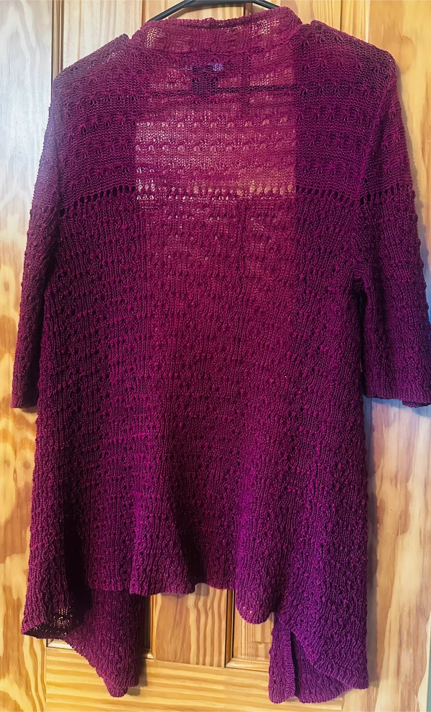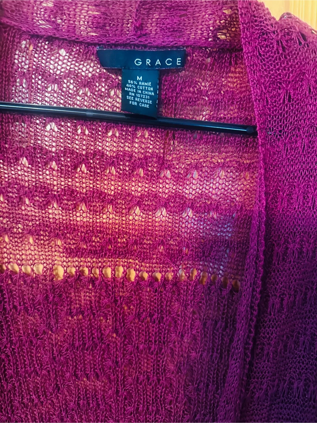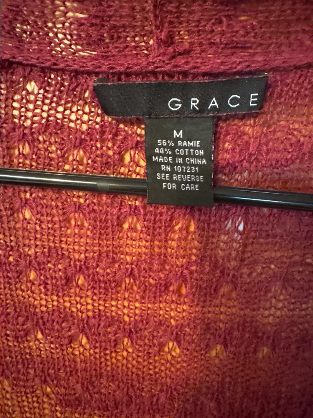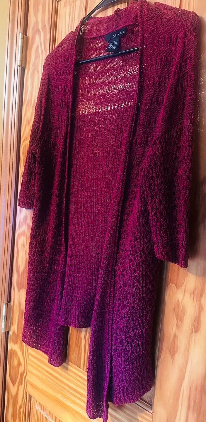 This Grace cardigan sweater is a size medium. It's made of 56% ramie and 44% cotton. The knit has an open, textured pattern.