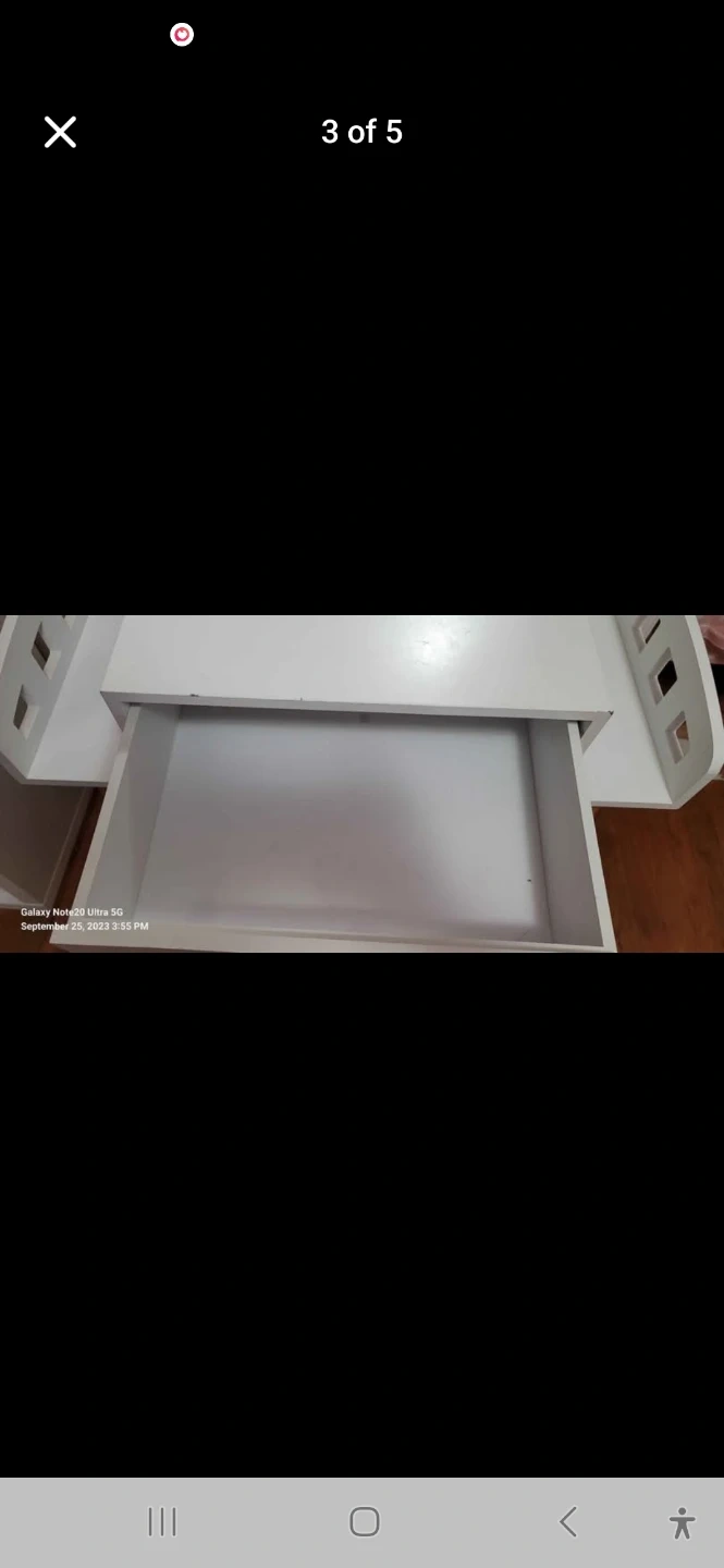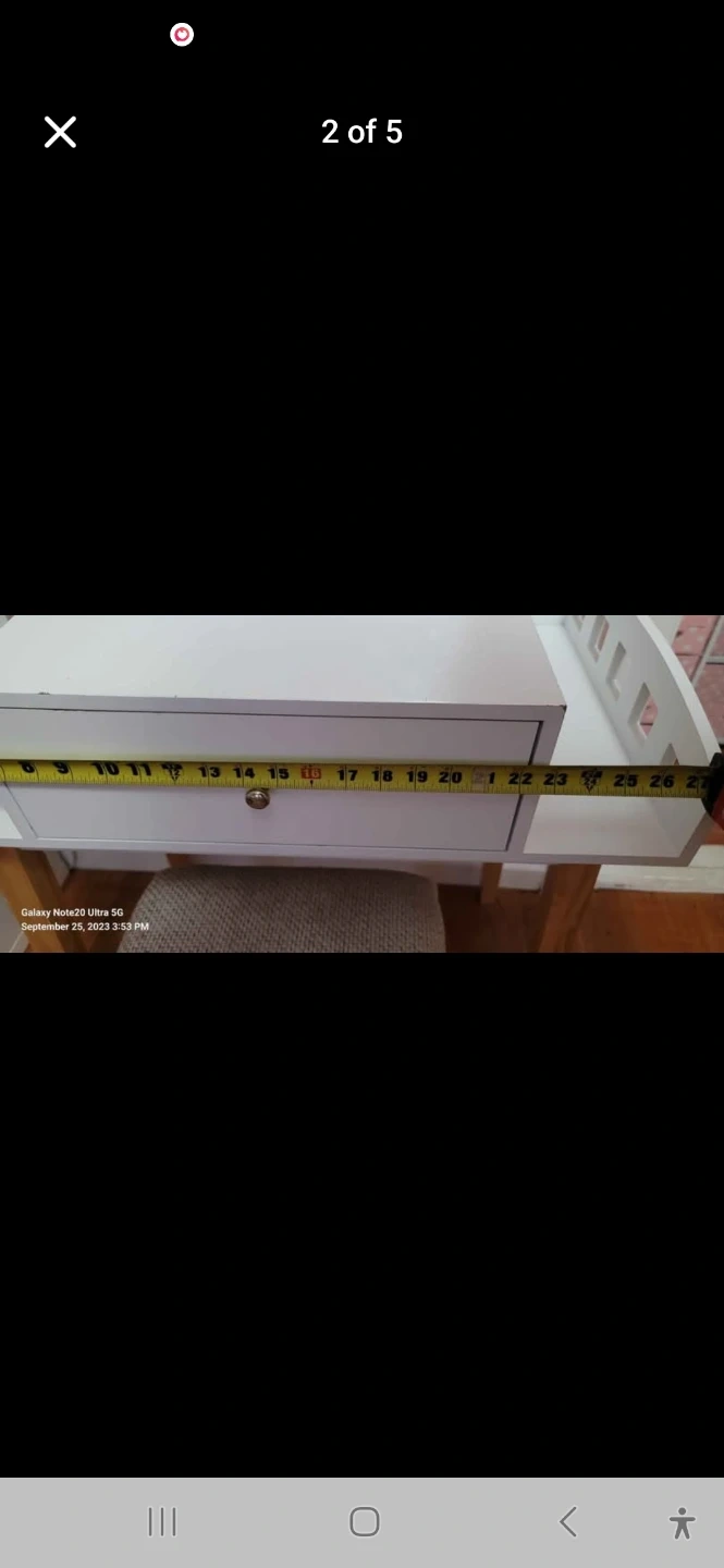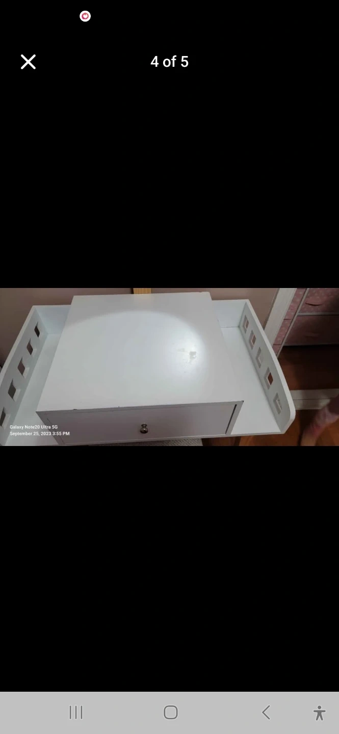 White vanity organizer designed for a tabletop. It features a single drawer with a silver knob for storage. The organizer has decorative slotted sides. Made of wood composite material.