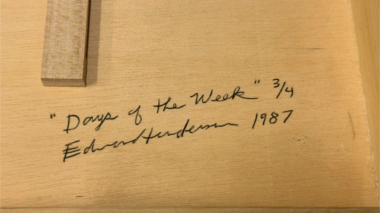 "Days of the Week" is a piece of art created by artist Edward Henderson in 1987, likely referring to a sculpture or installation that visually represents the seven days of the week through various materials and forms.